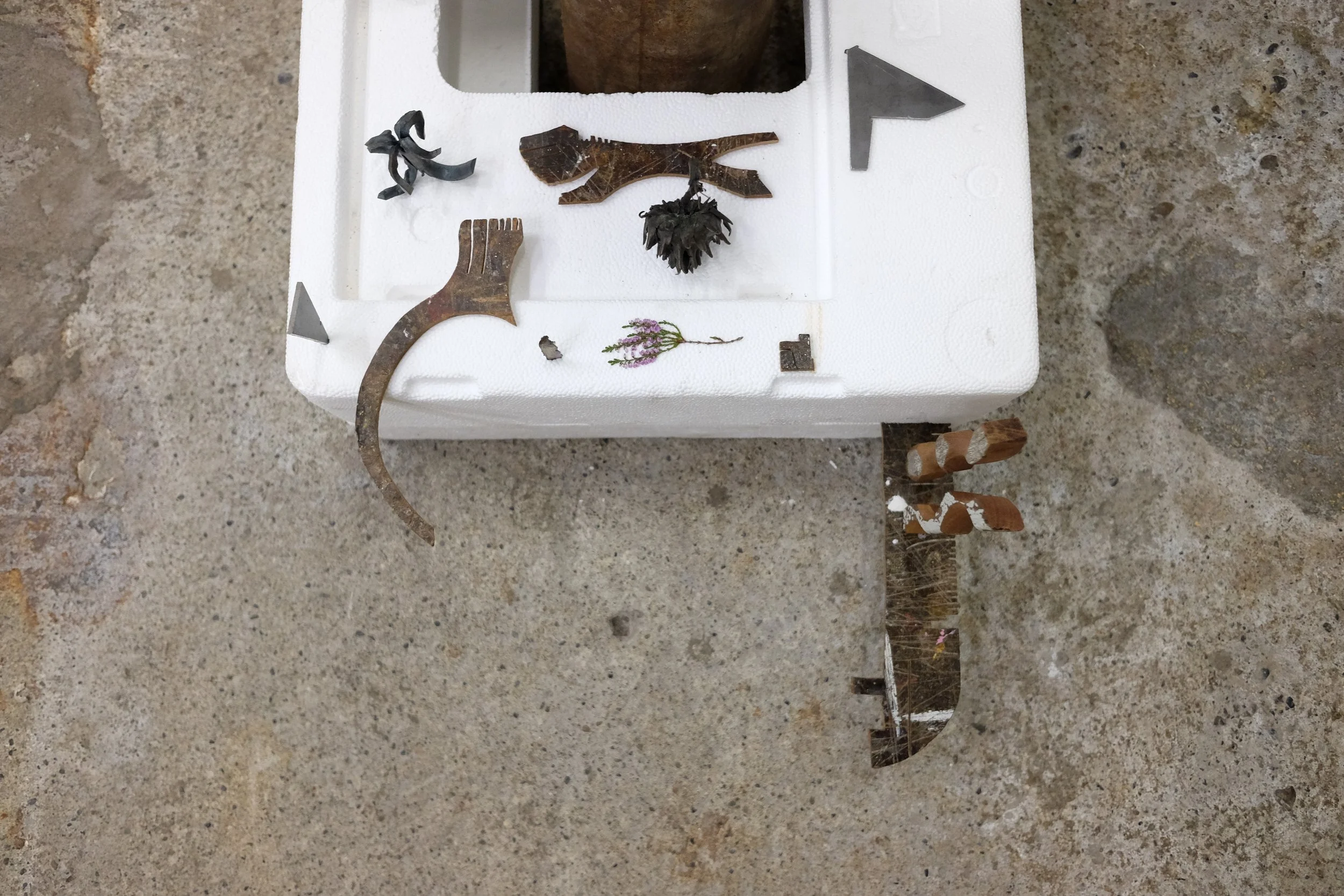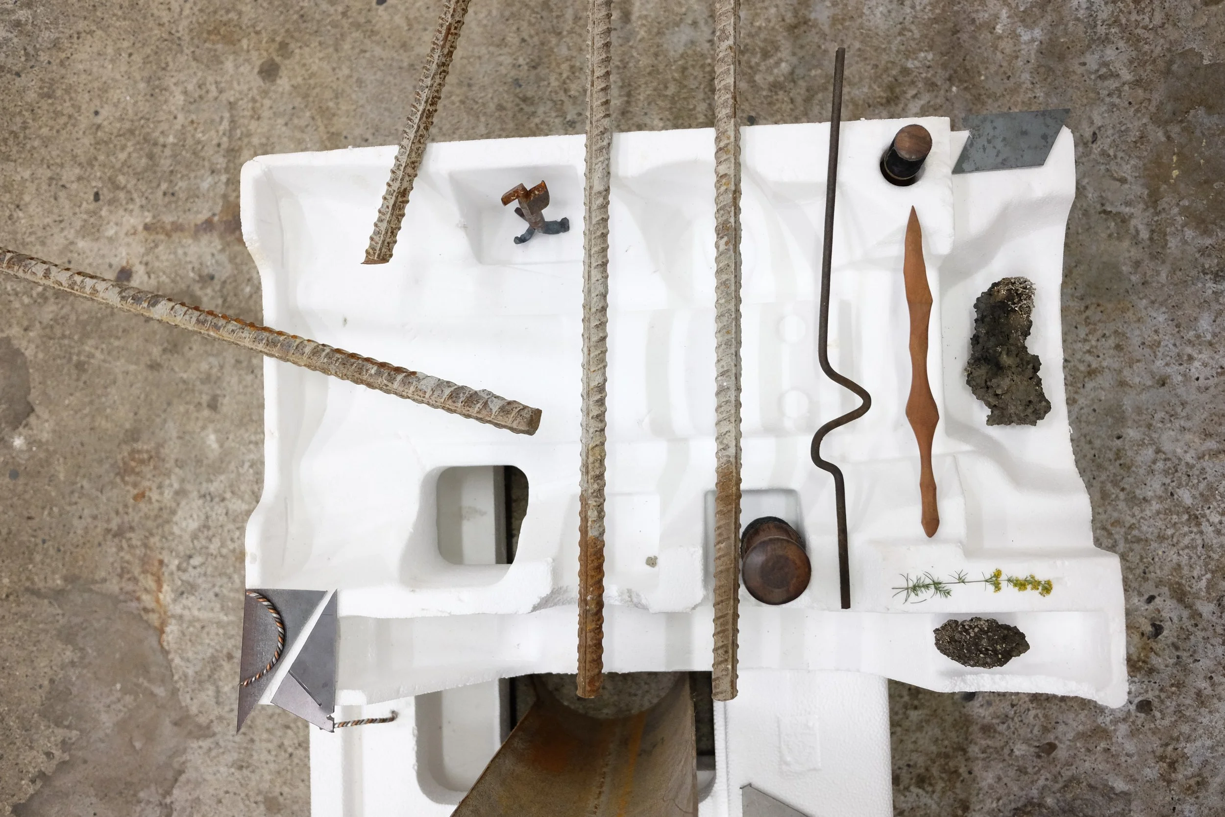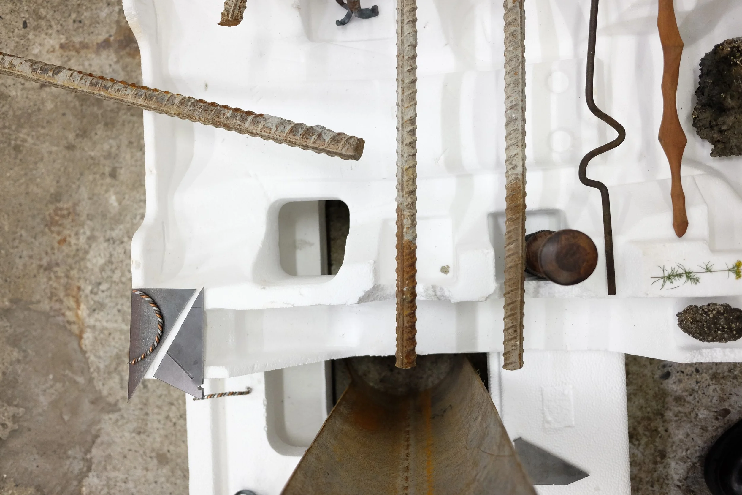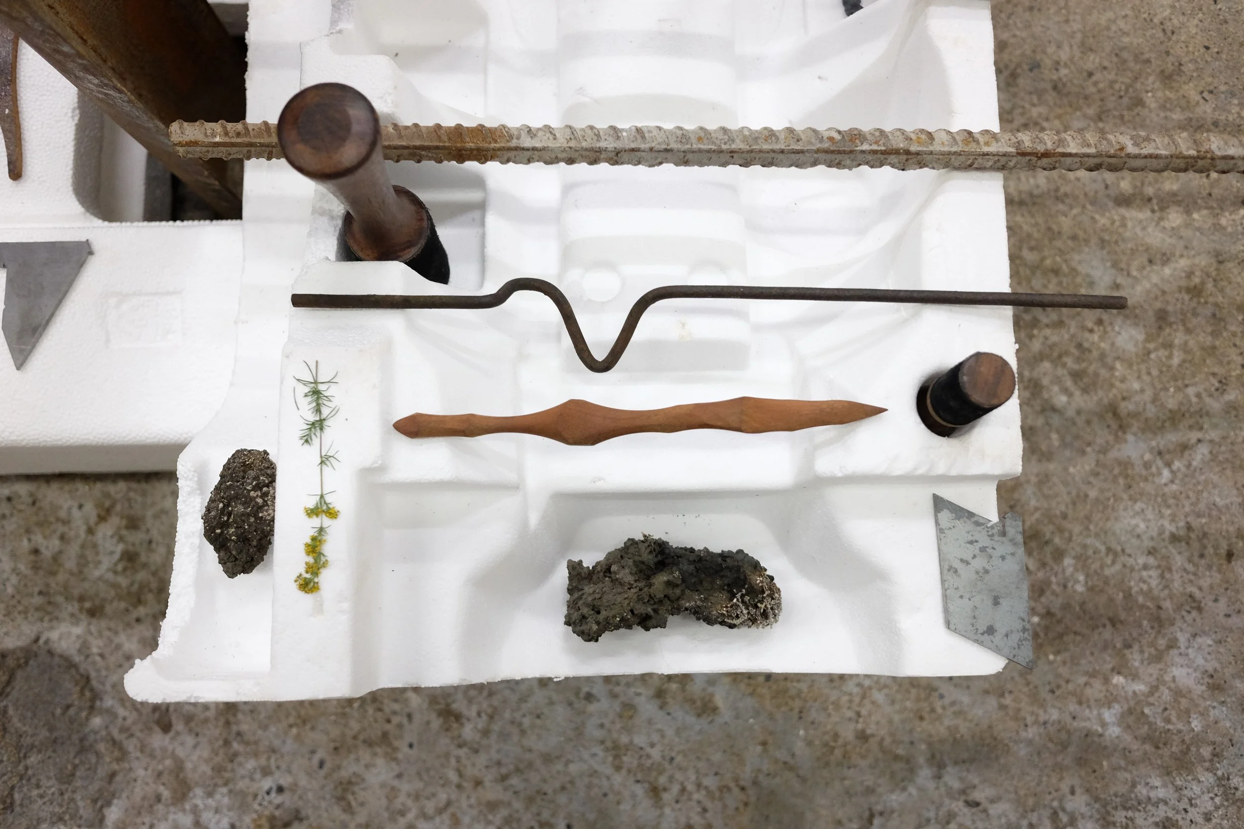 Found polystyrene, found rebar steel, found wood, Mt Vesuvius volcanic rock, pressed Irish wildflowers, bronze, gifted Bát Tràng ceramic, found glass, Nepalese singing bowl mallets.