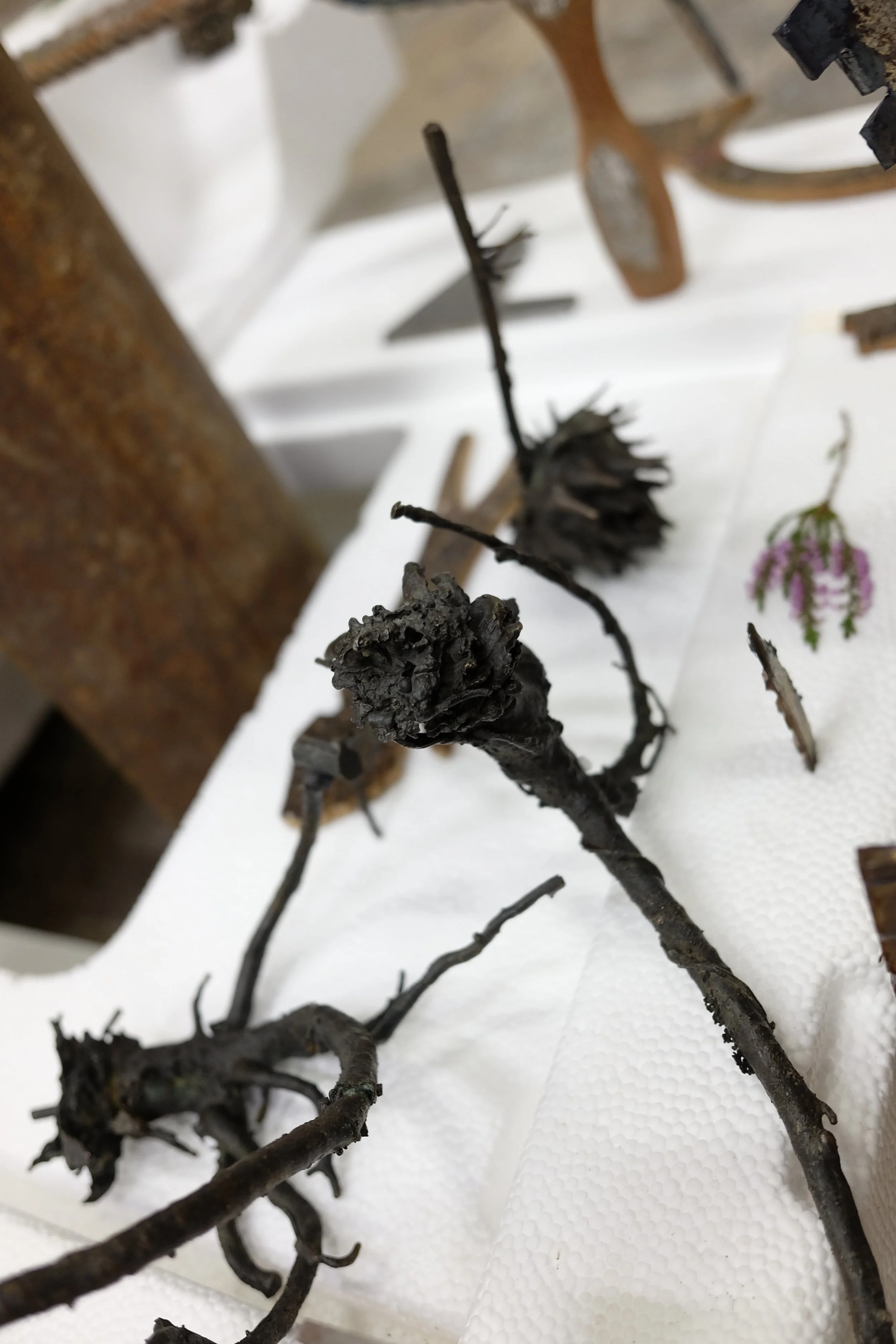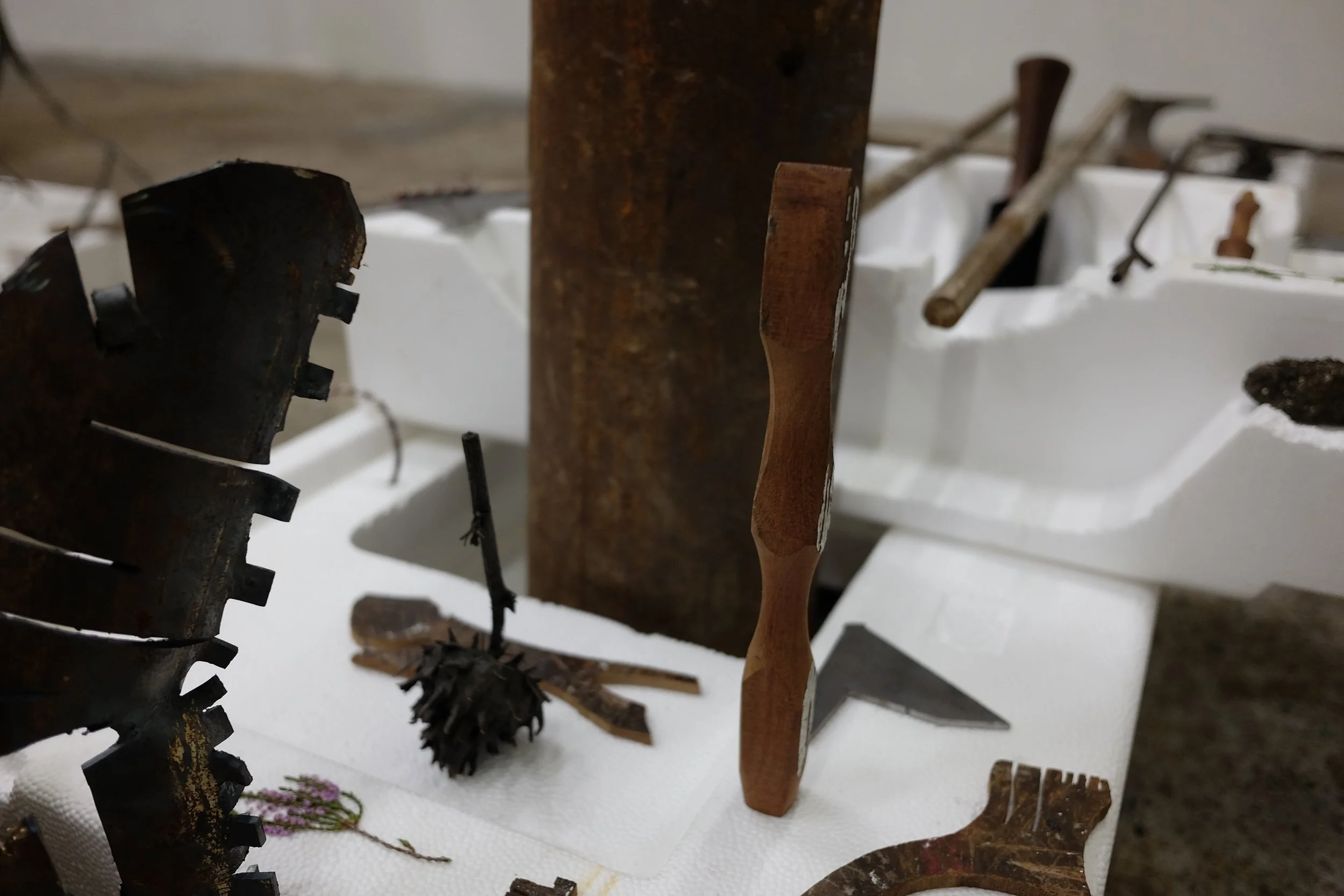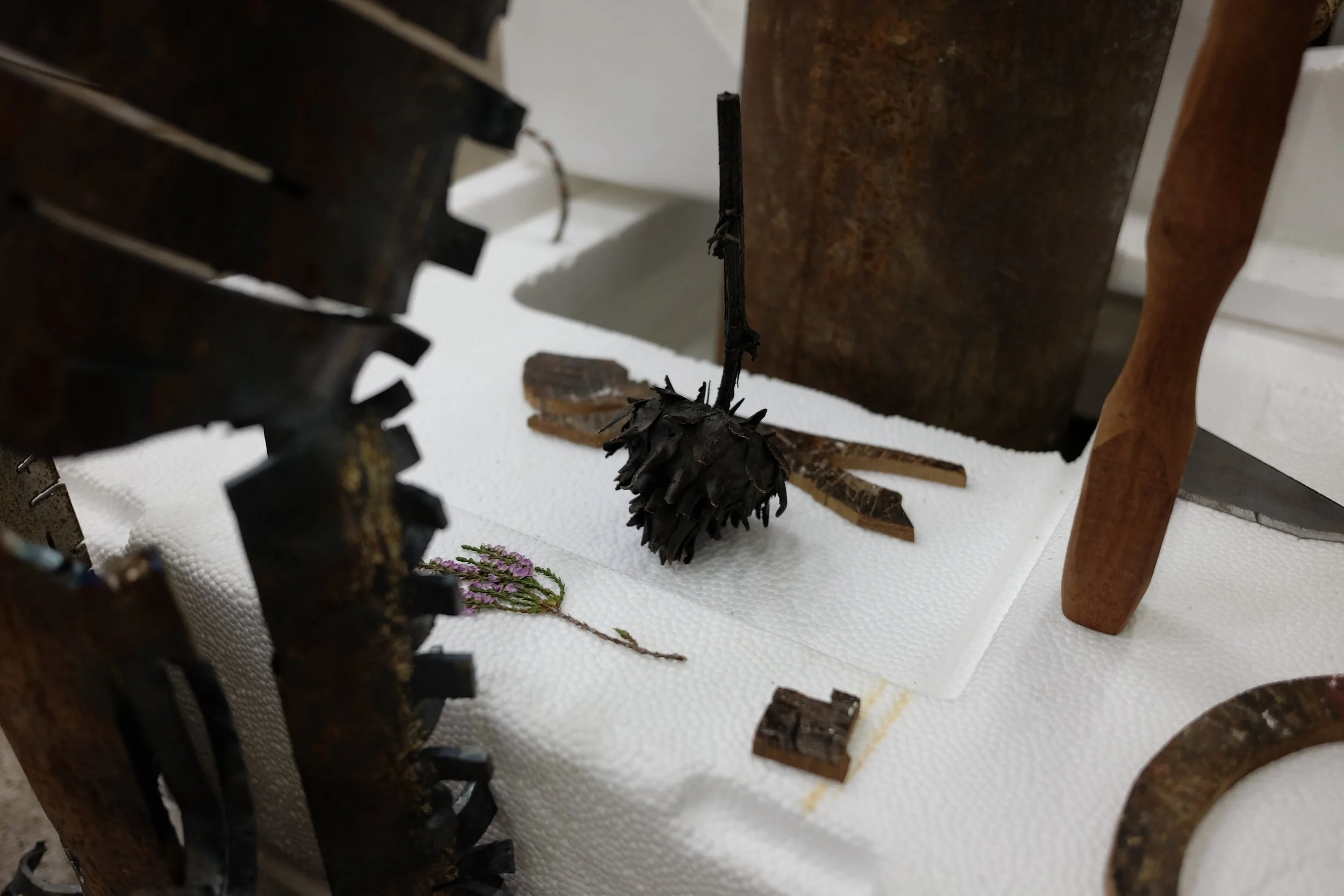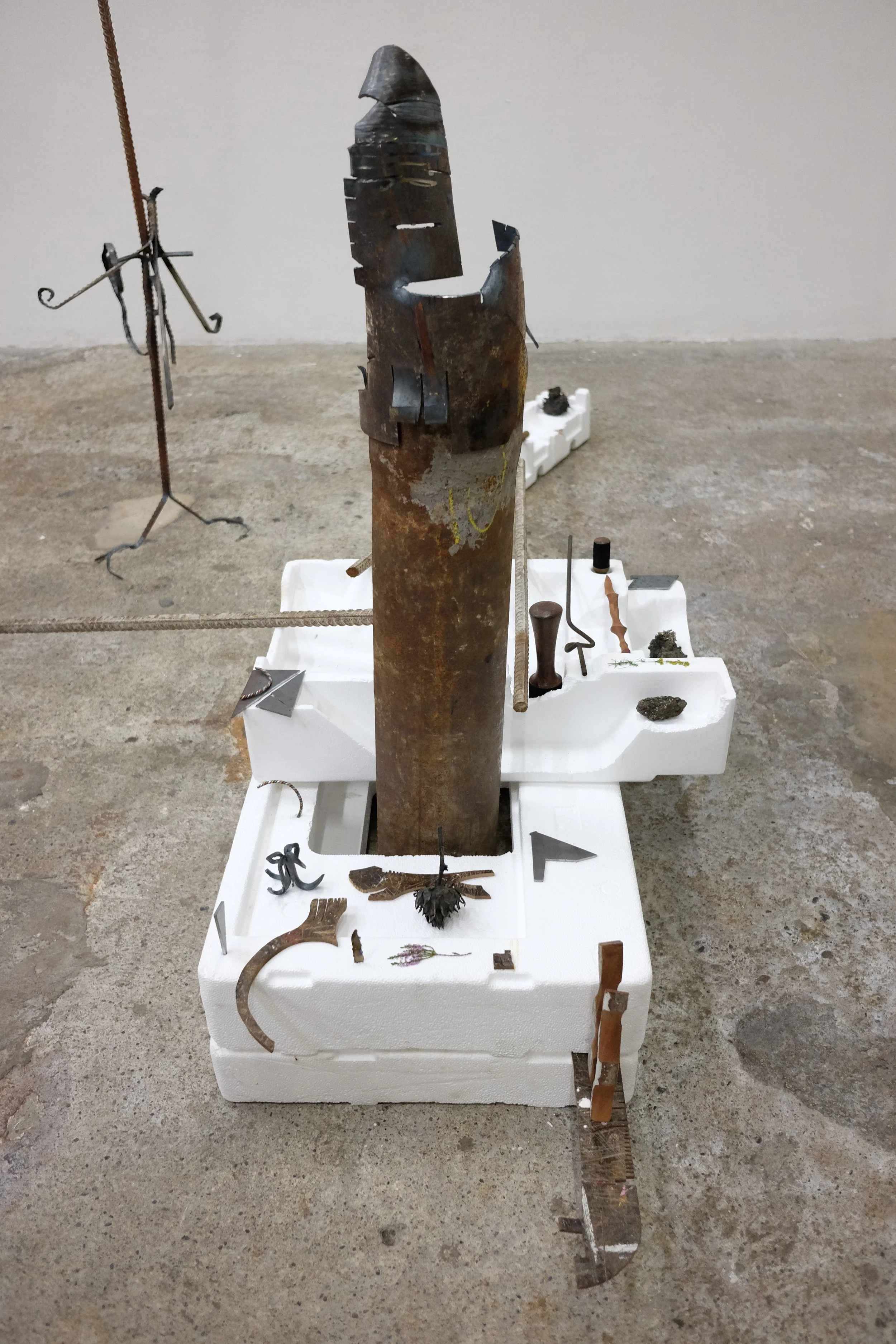 Found polystyrene, found rebar steel, found wood, Mt Vesuvius volcanic rock, pressed Irish wildflowers, bronze, gifted Bát Tràng ceramic, found glass, Nepalese singing bowl mallets.