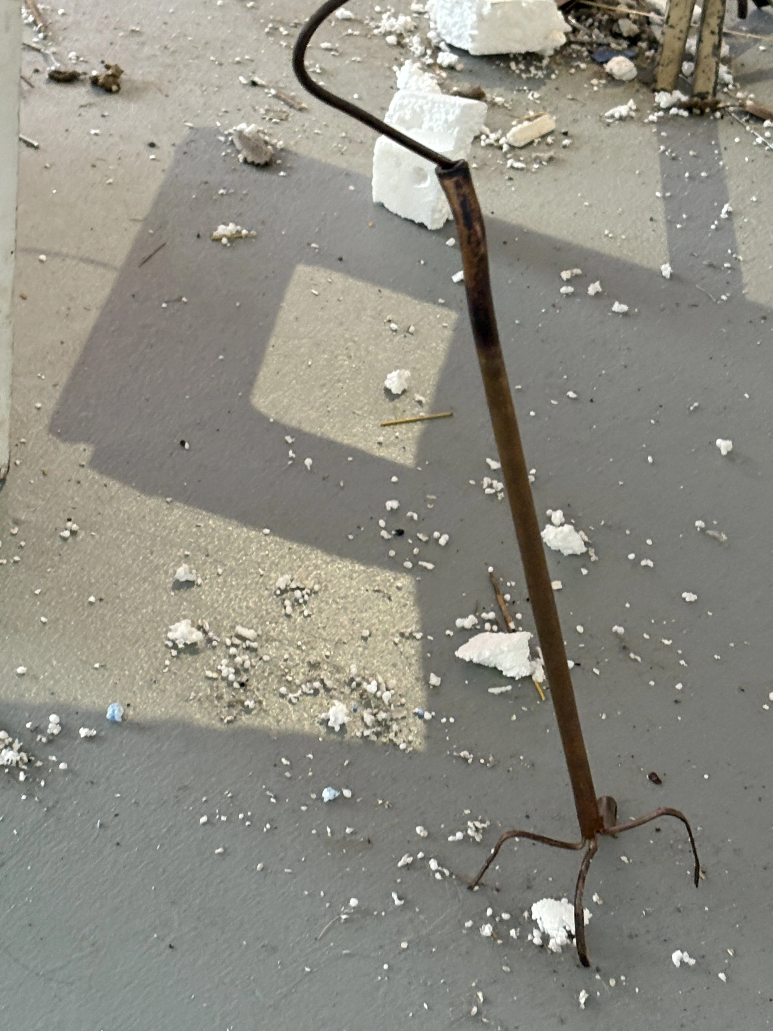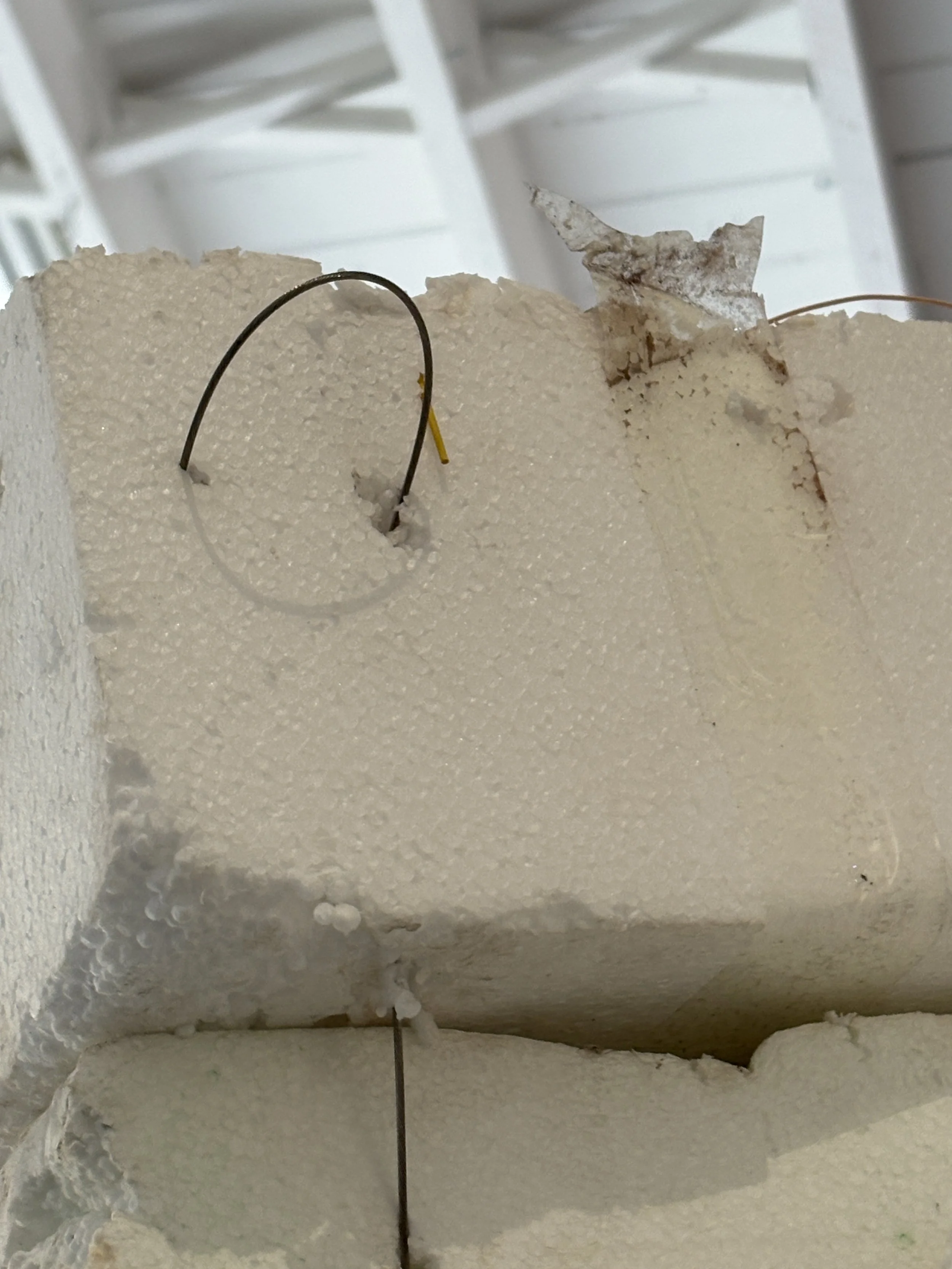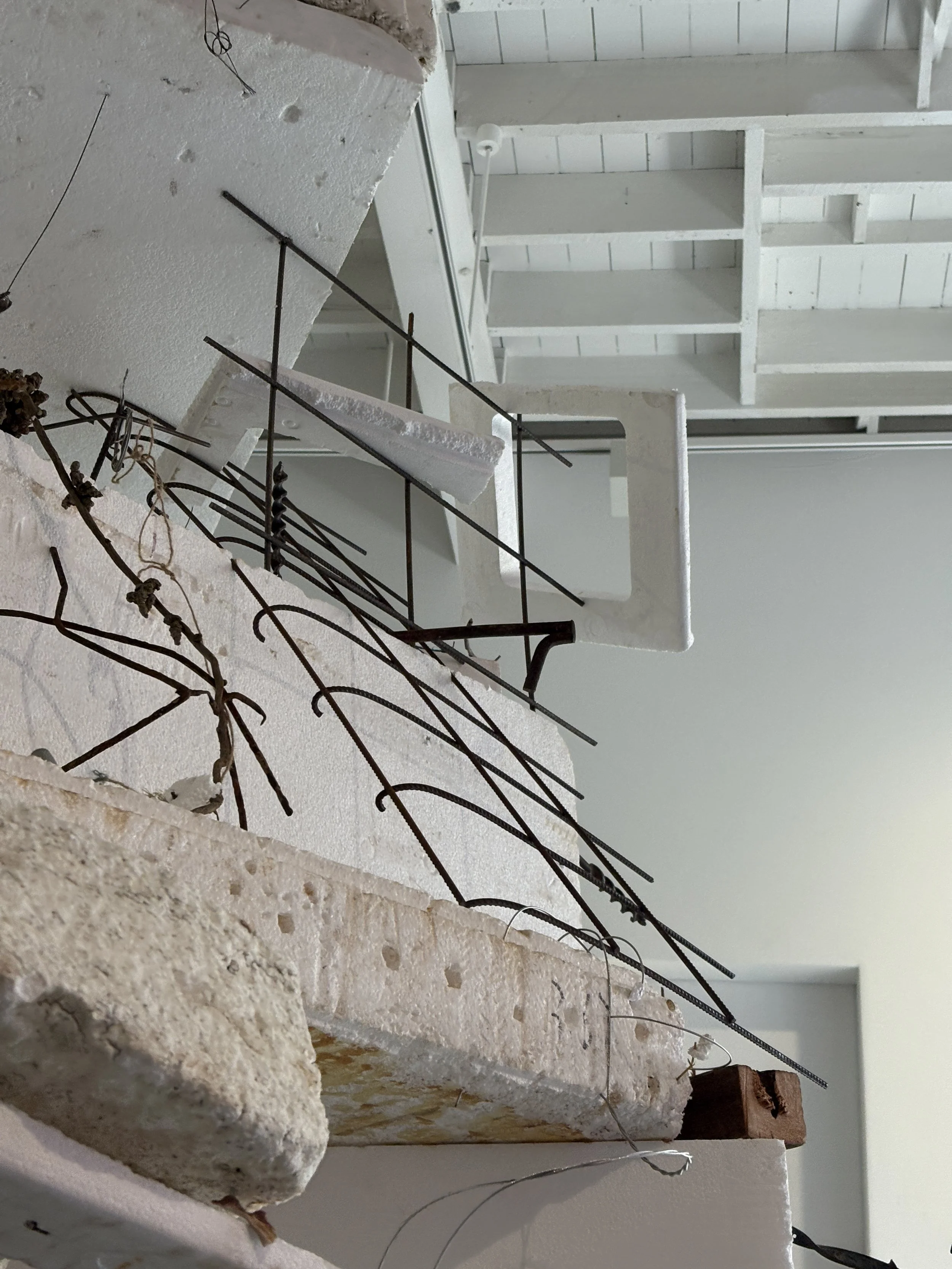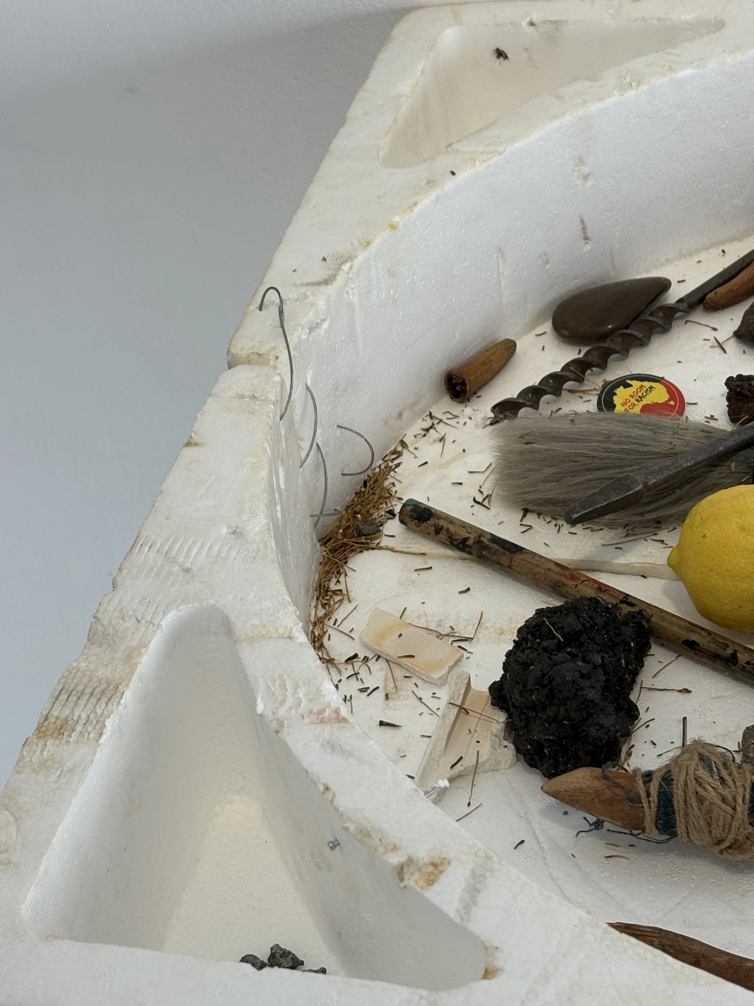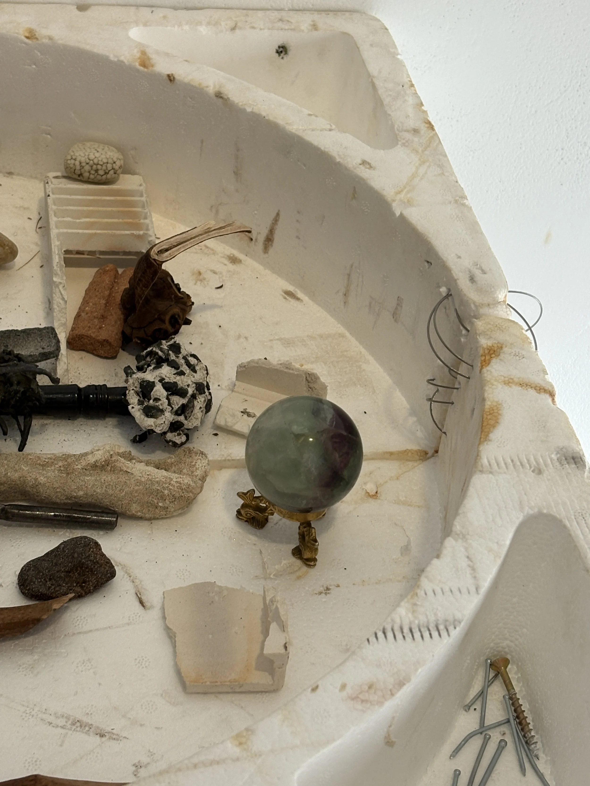 I dig dig dig into the ground and I find golf balls, bits of broken glass and what seems to be a mix of sand and microplastics. I don't know what year it is. I gather this polystyrene and I stack it. I wrap it with wire, I twist it all around, I wring out my hands with confusion and resolve to learn more. I learn more each time I speak with her, when I commune with her divine grace, when he reaches towards me with joy and squeezes. There are spirits in this plastic. Benzene, flame retardants. Holy things. Strange things. I live a little bit more and observe the trail I leave behind. I trace my fingers through the muck and dust and leave remnants behind. I am a remnant, I am left behind, borrowing from the giants and tucking myself in using their big smelly socks.