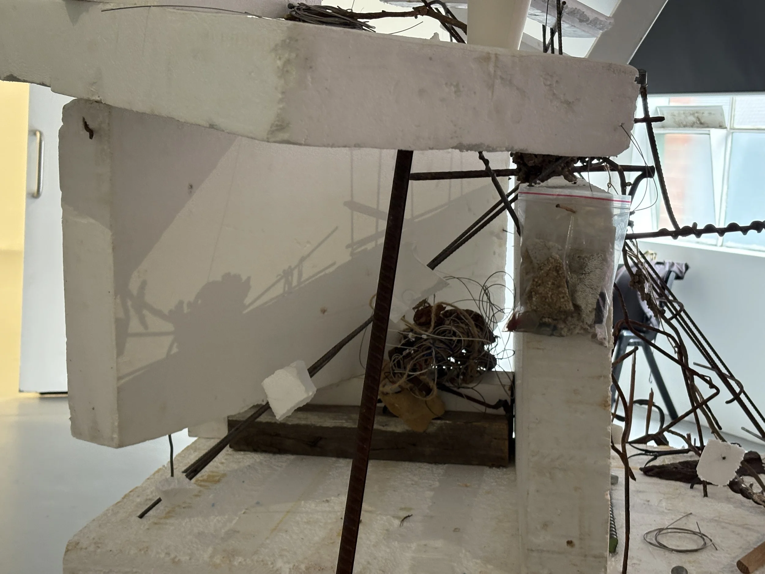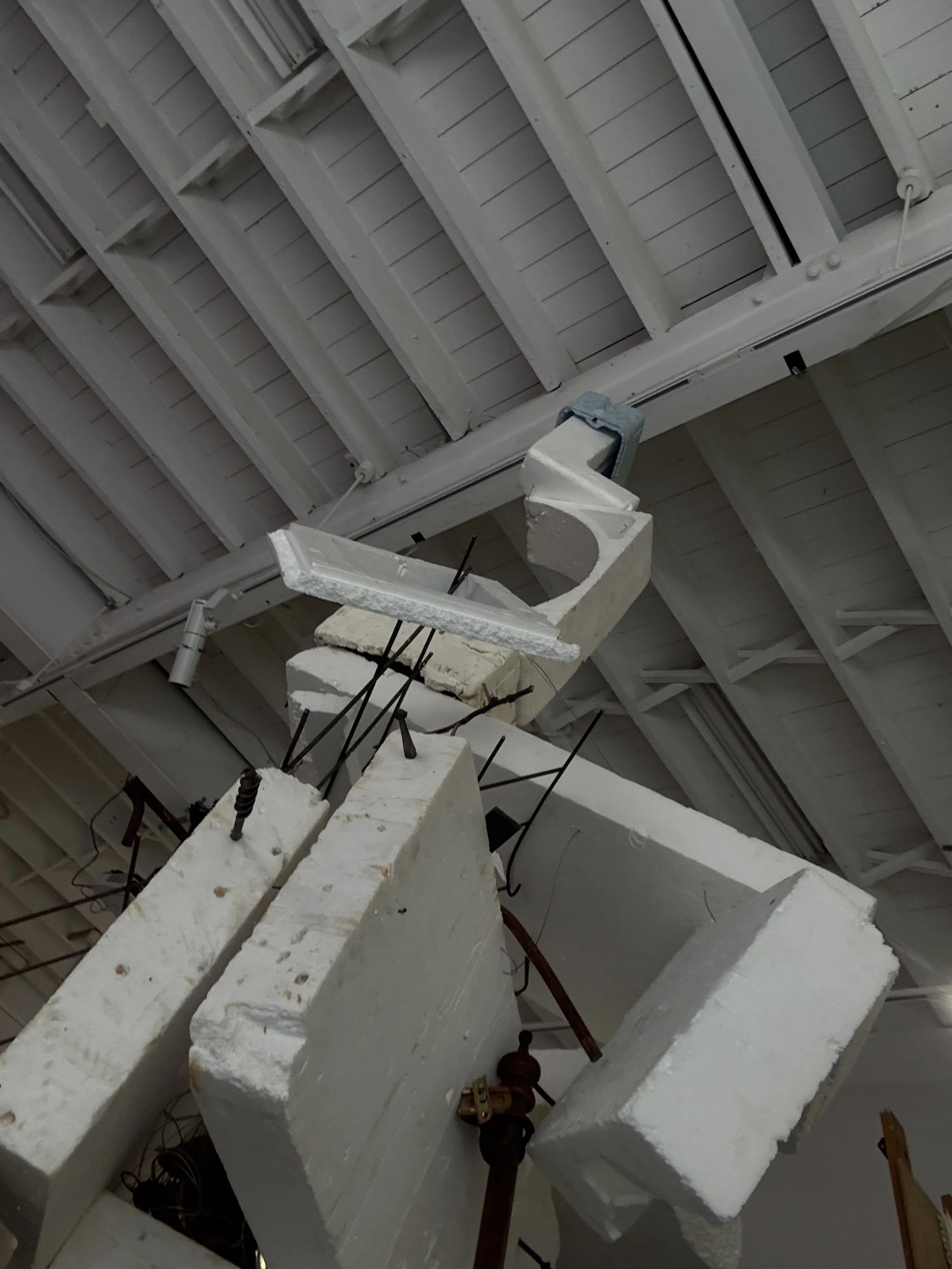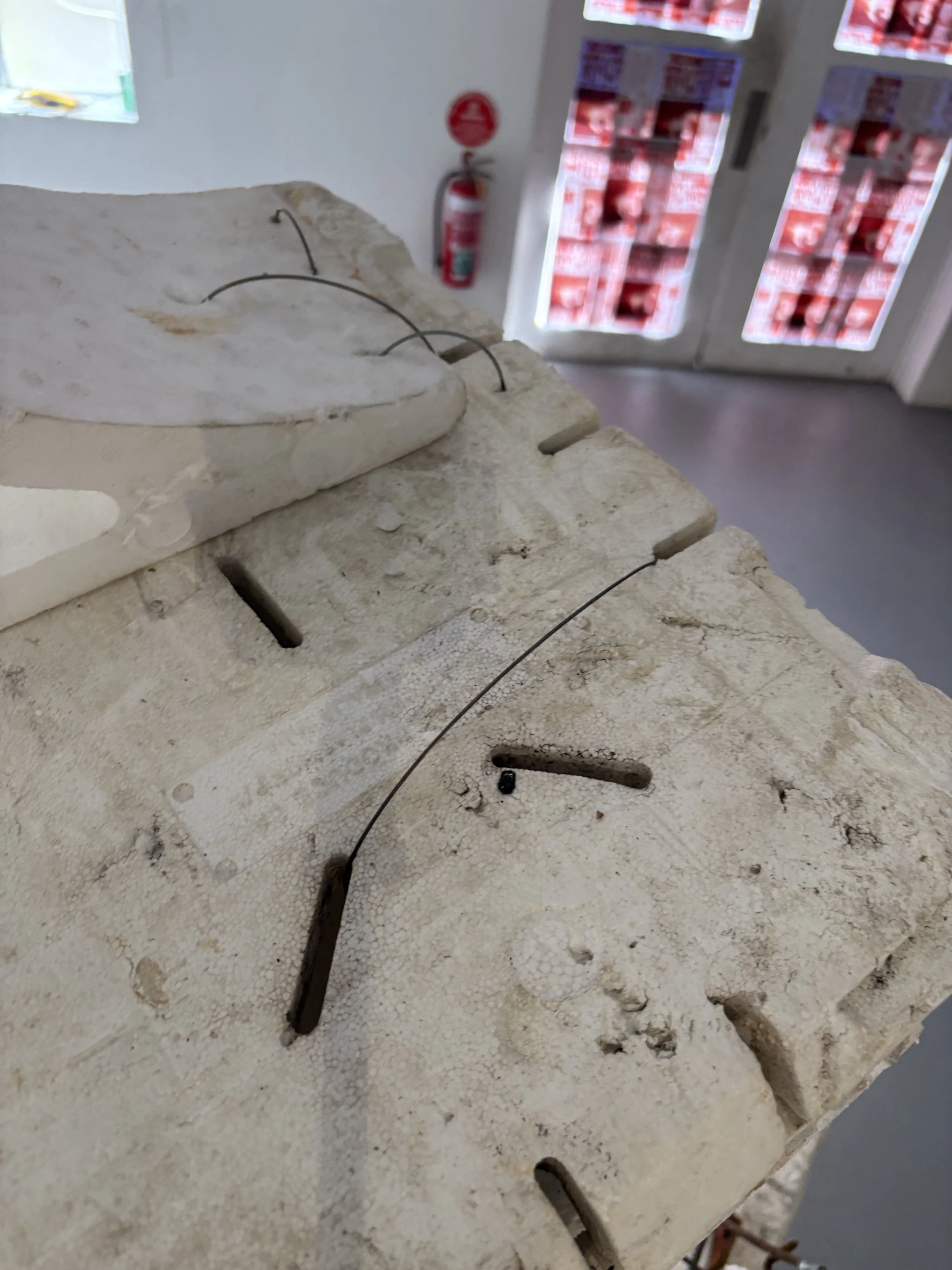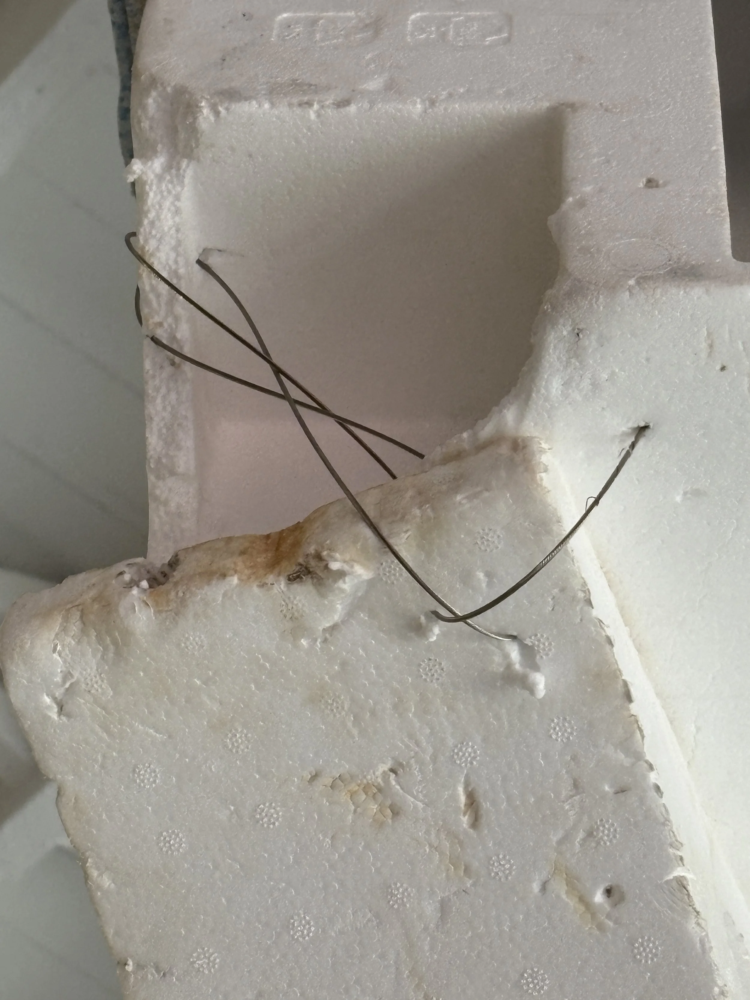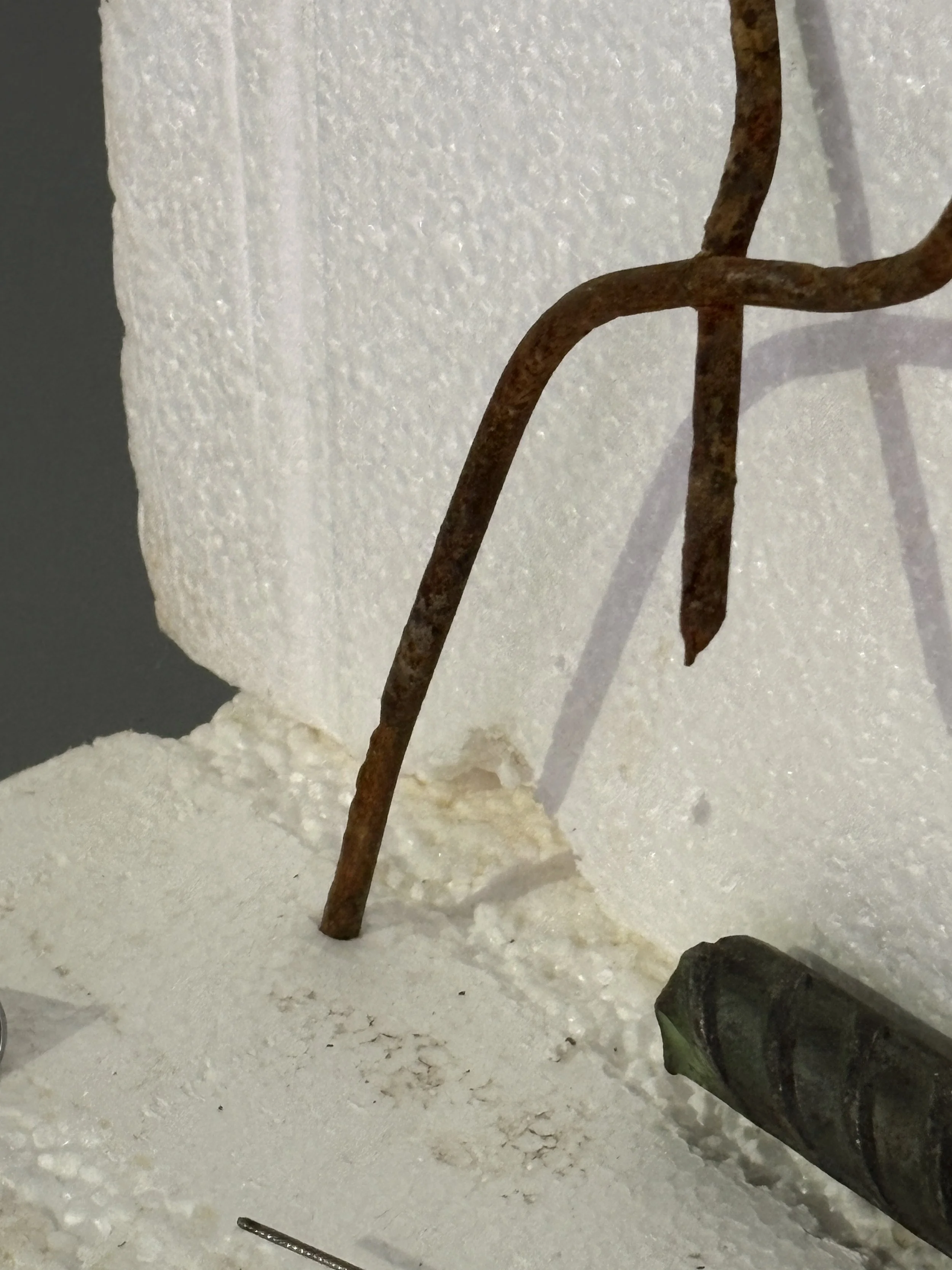 I dig dig dig into the ground and I find golf balls, bits of broken glass and what seems to be a mix of sand and microplastics. I don't know what year it is. I gather this polystyrene and I stack it. I wrap it with wire, I twist it all around, I wring out my hands with confusion and resolve to learn more. I learn more each time I speak with her, when I commune with her divine grace, when he reaches towards me with joy and squeezes. There are spirits in this plastic. Benzene, flame retardants. Holy things. Strange things. I live a little bit more and observe the trail I leave behind. I trace my fingers through the muck and dust and leave remnants behind. I am a remnant, I am left behind, borrowing from the giants and tucking myself in using their big smelly socks.