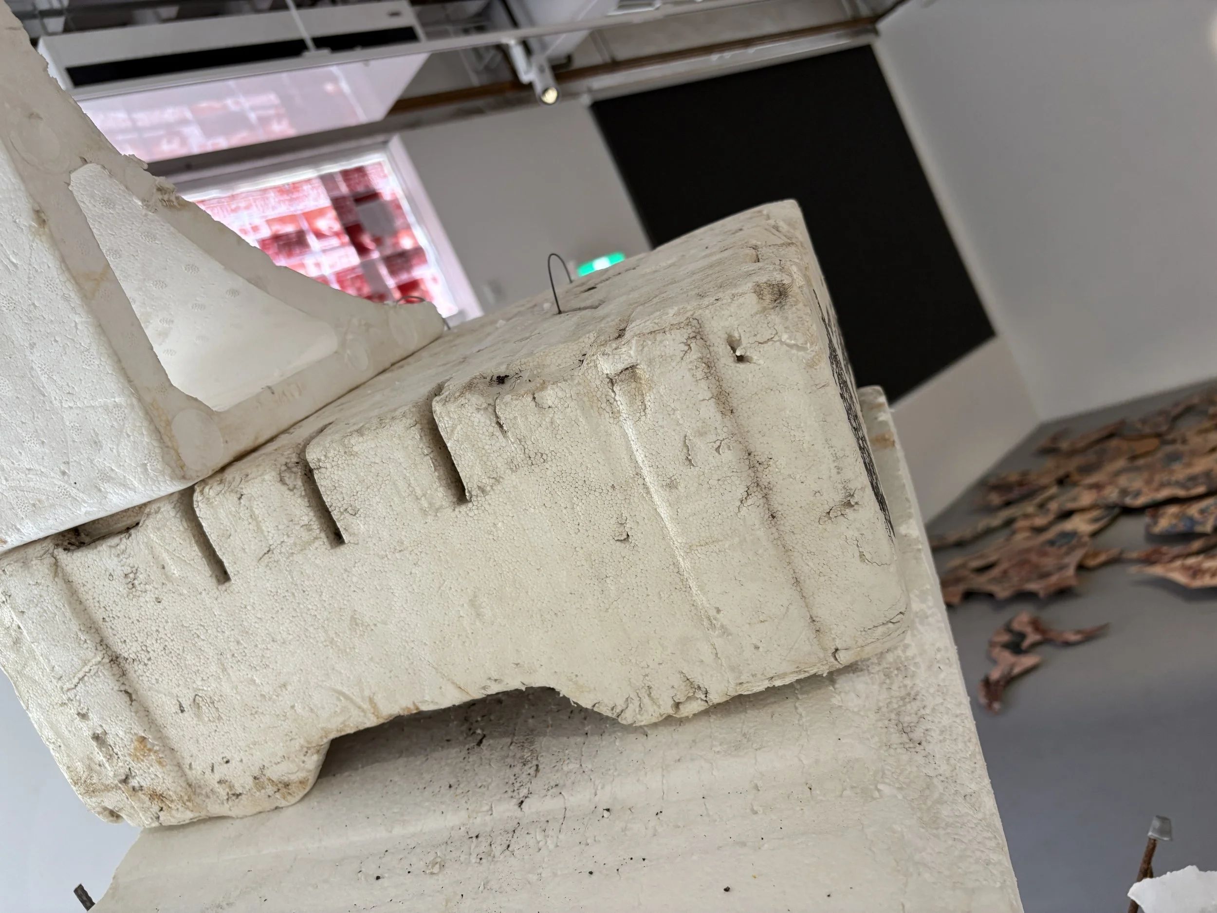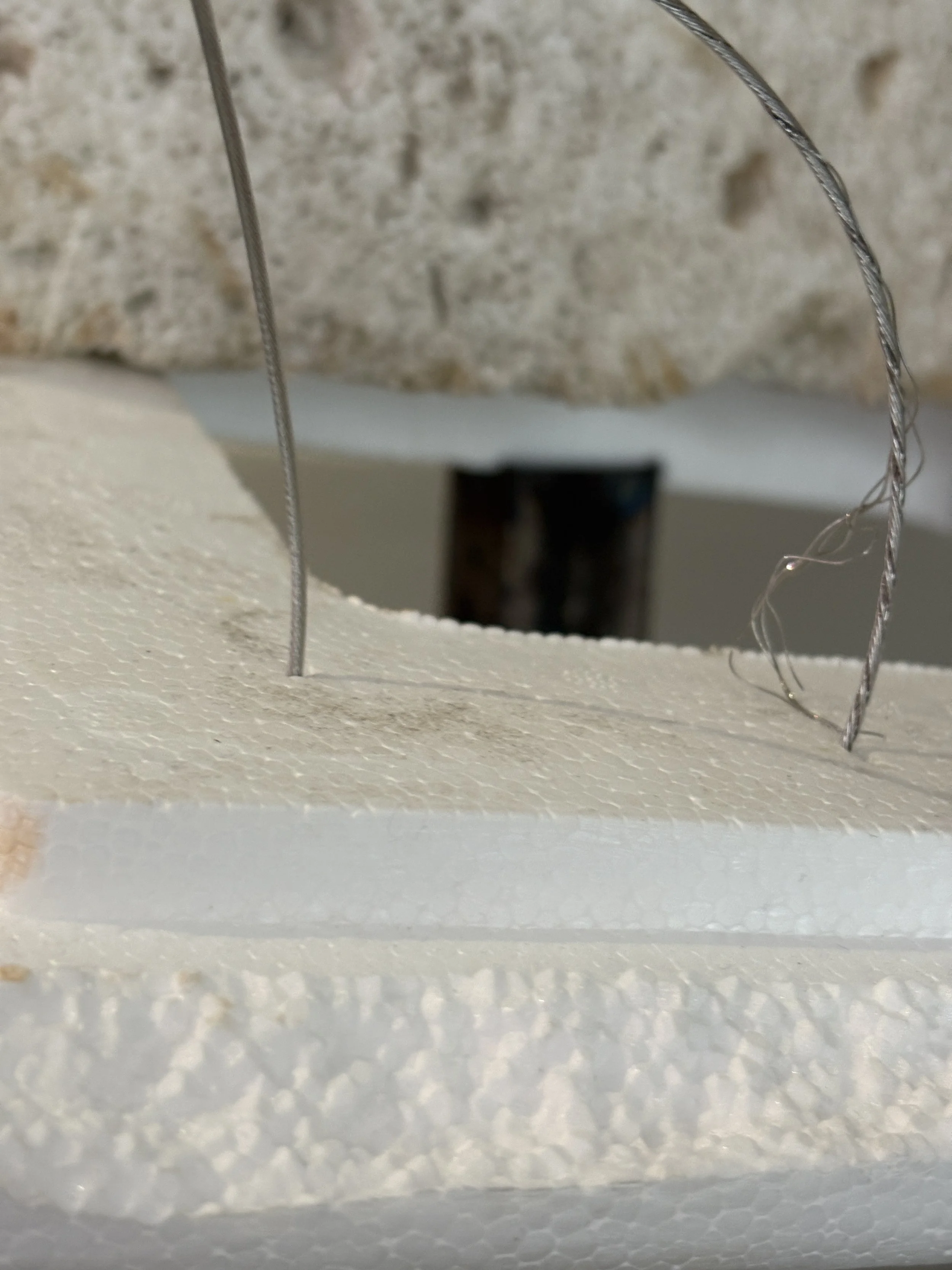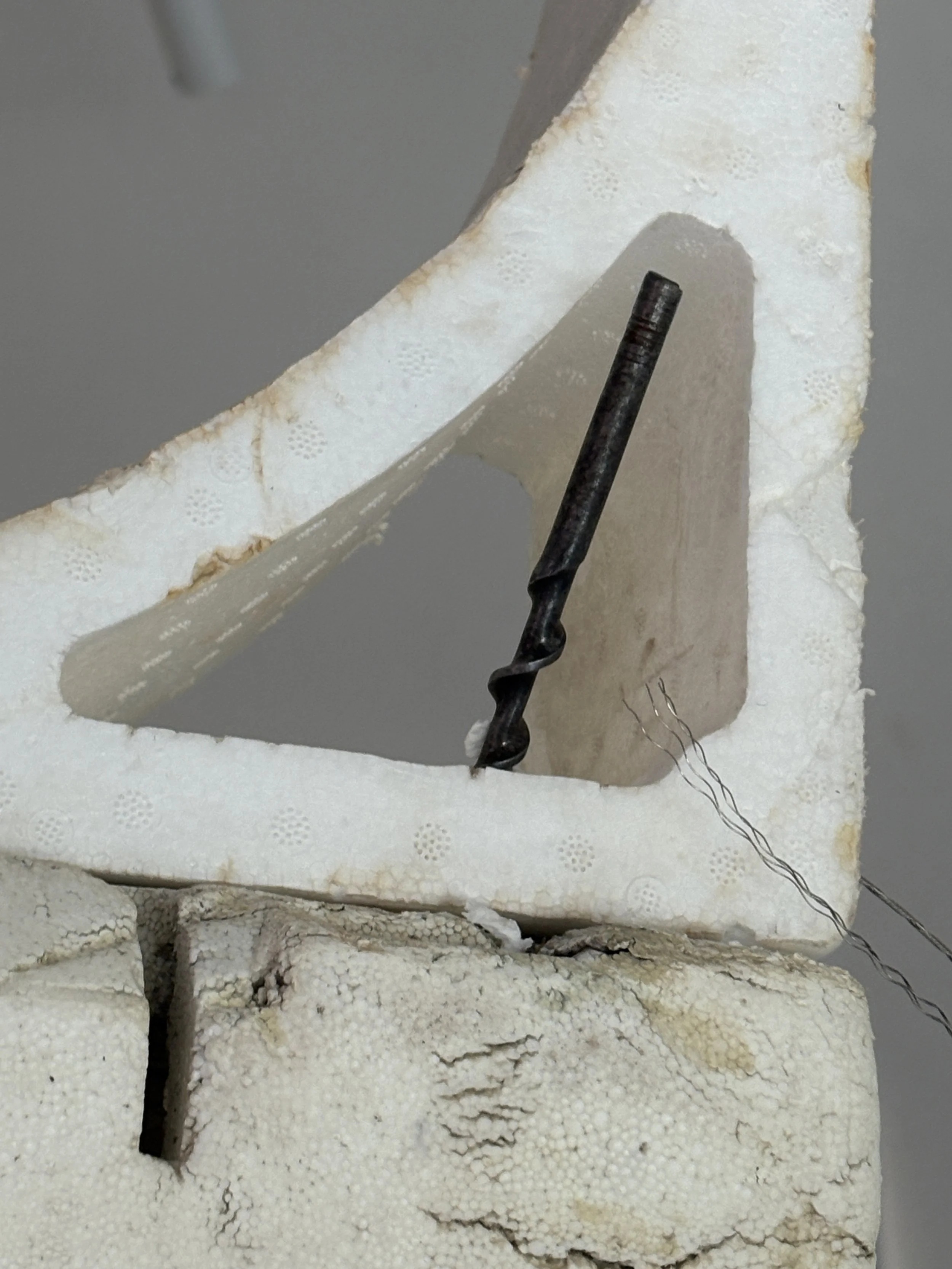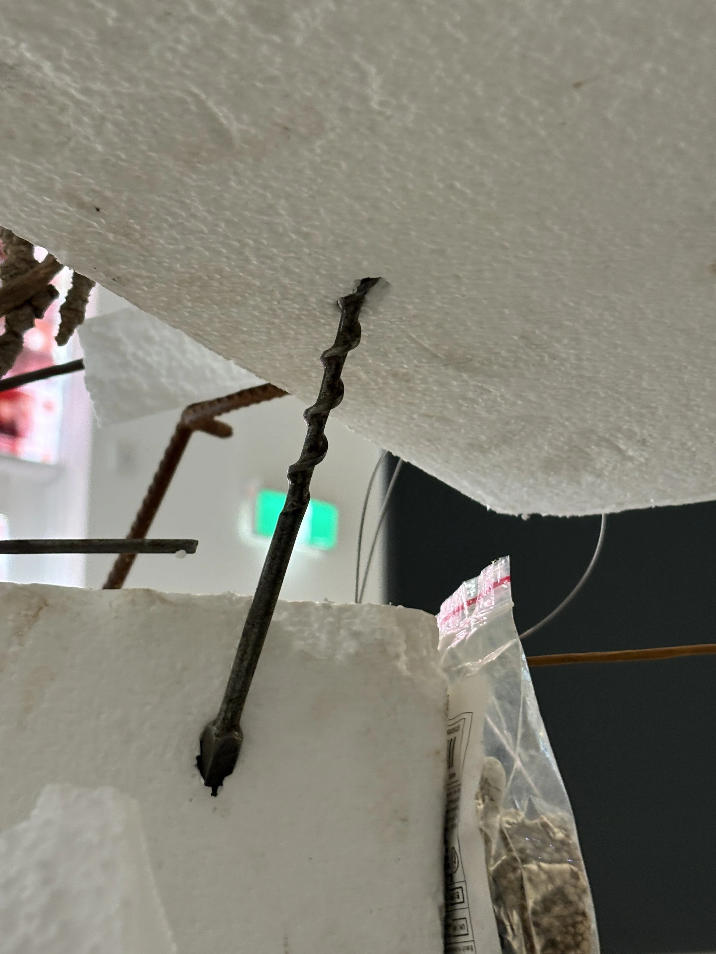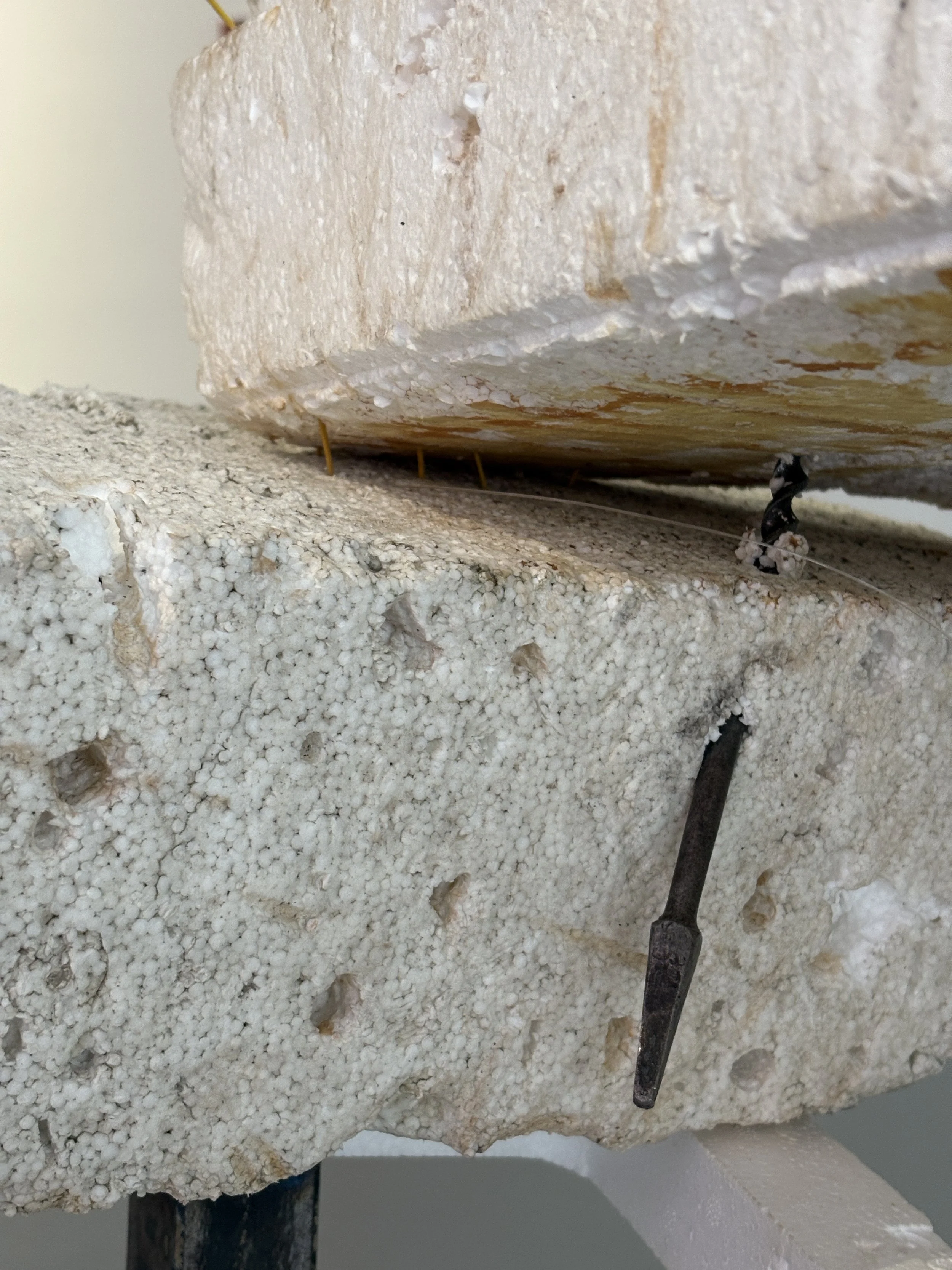 I dig dig dig into the ground and I find golf balls, bits of broken glass and what seems to be a mix of sand and microplastics. I don't know what year it is. I gather this polystyrene and I stack it. I wrap it with wire, I twist it all around, I wring out my hands with confusion and resolve to learn more. I learn more each time I speak with her, when I commune with her divine grace, when he reaches towards me with joy and squeezes. There are spirits in this plastic. Benzene, flame retardants. Holy things. Strange things. I live a little bit more and observe the trail I leave behind. I trace my fingers through the muck and dust and leave remnants behind. I am a remnant, I am left behind, borrowing from the giants and tucking myself in using their big smelly socks.