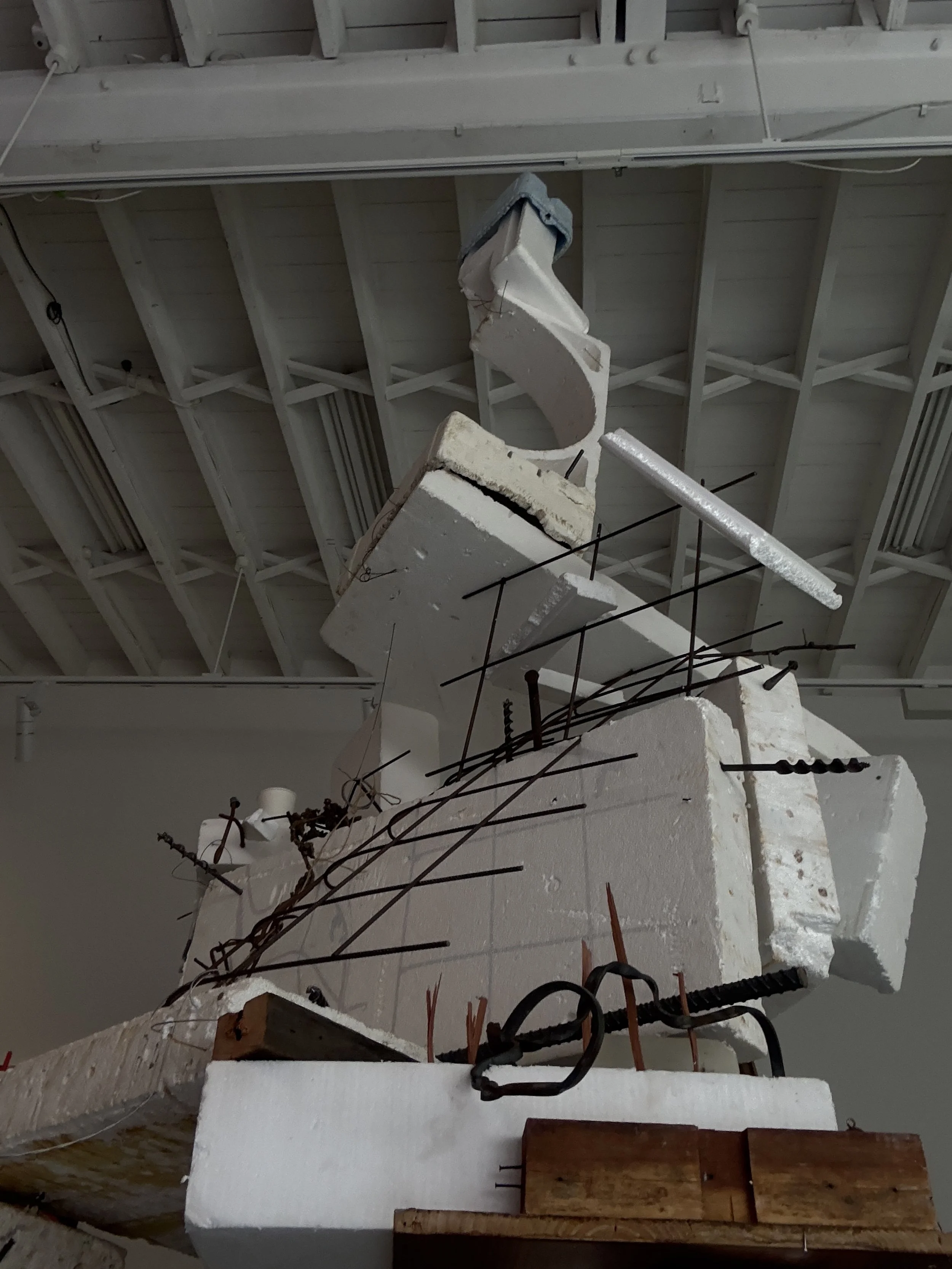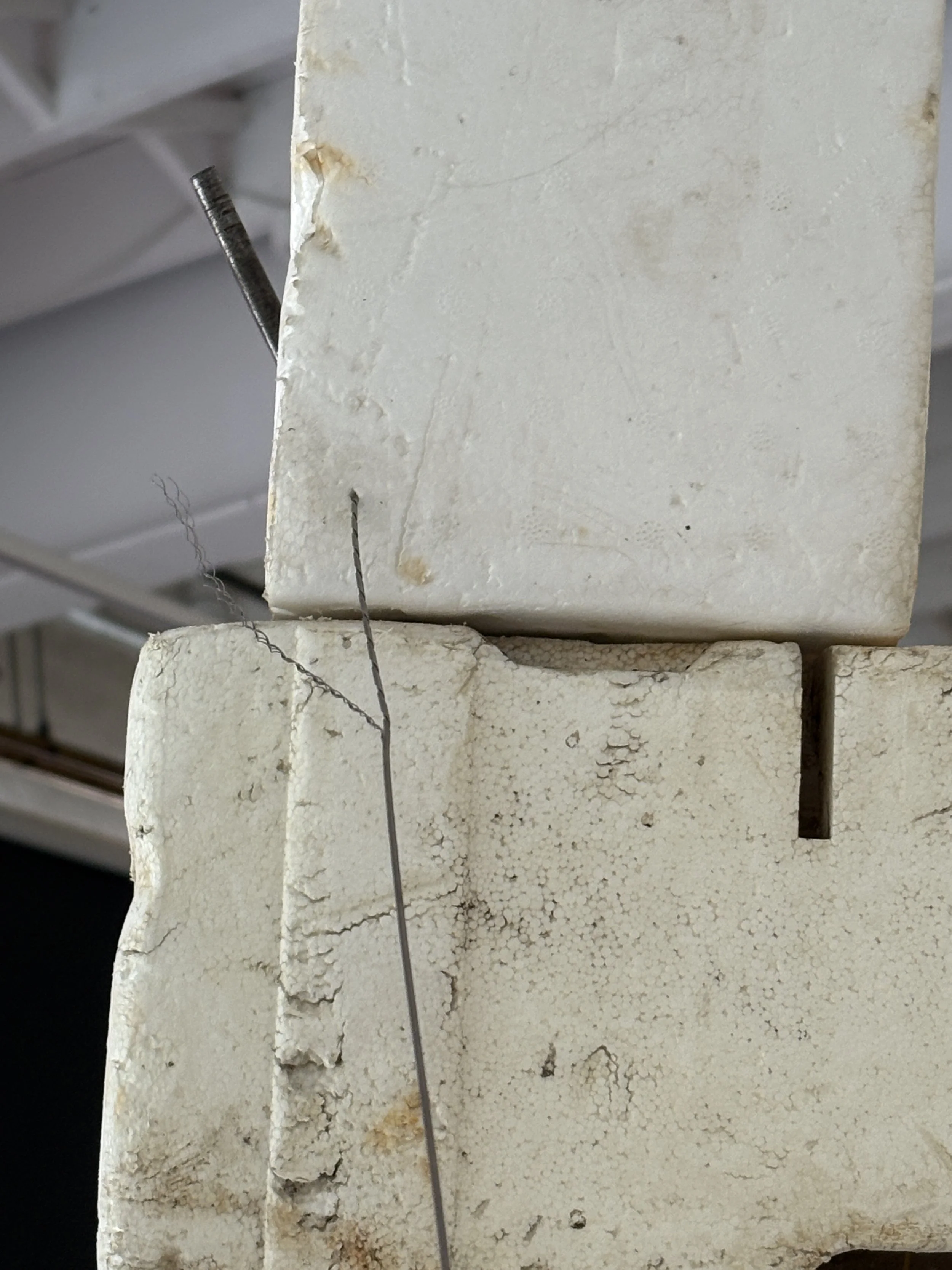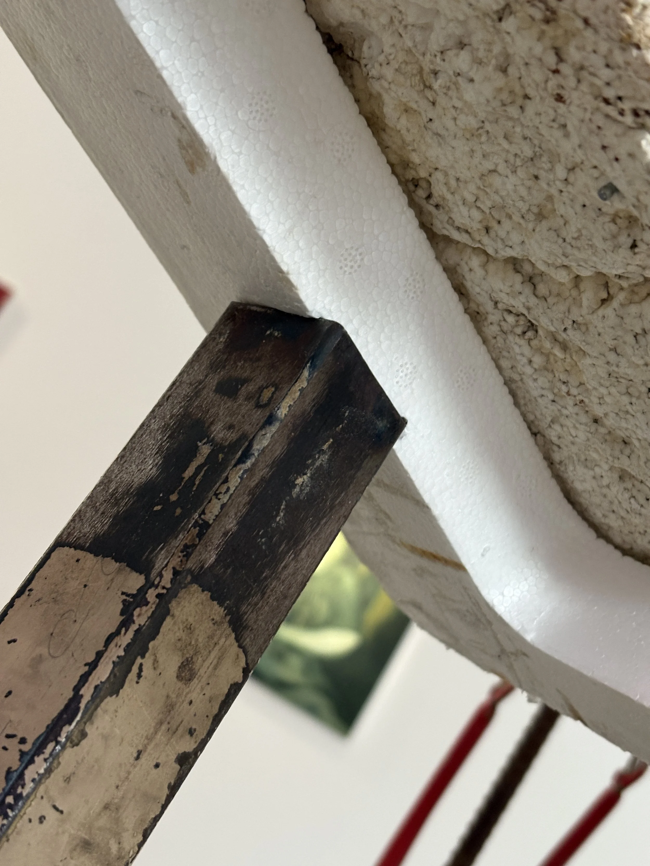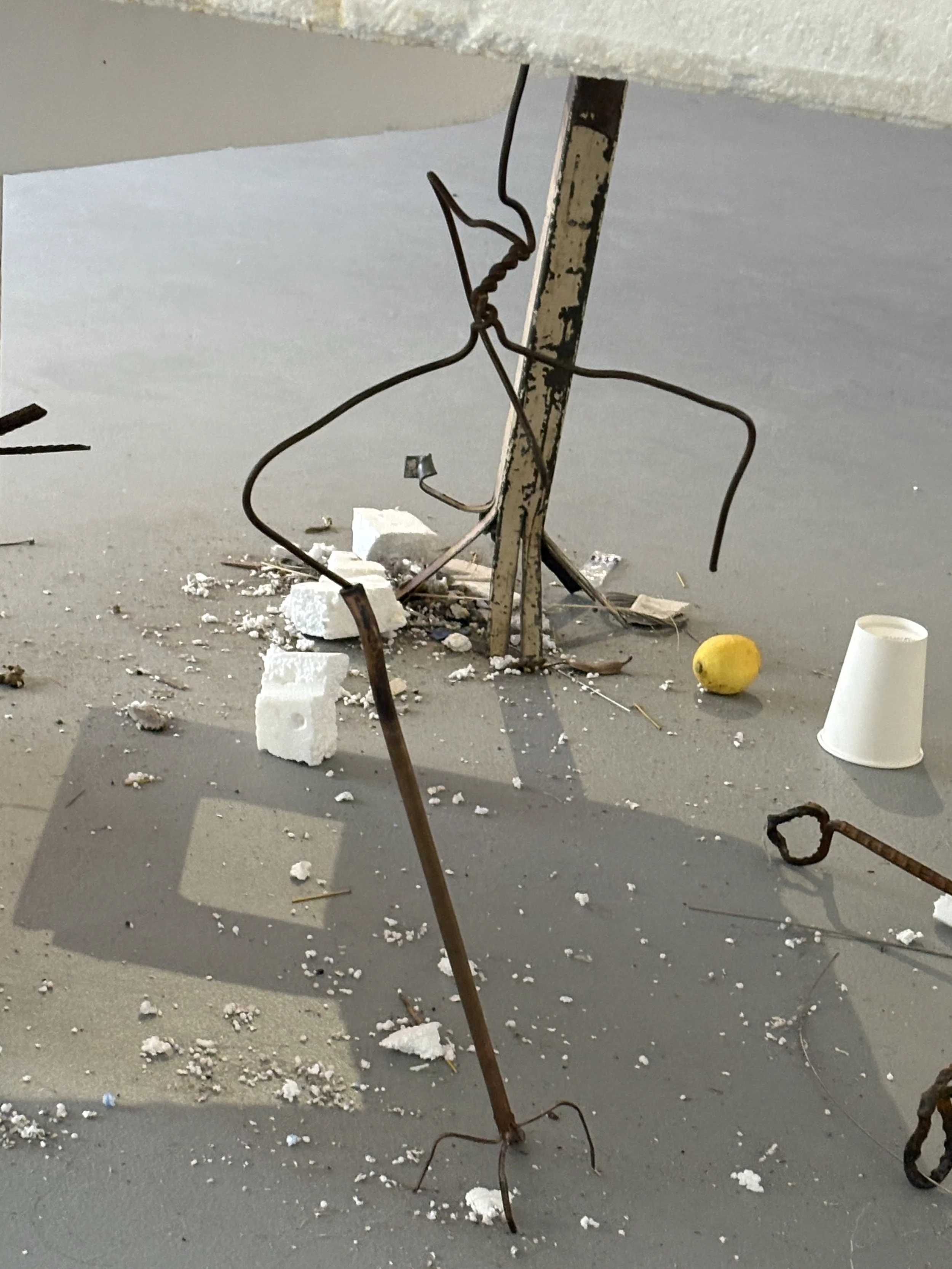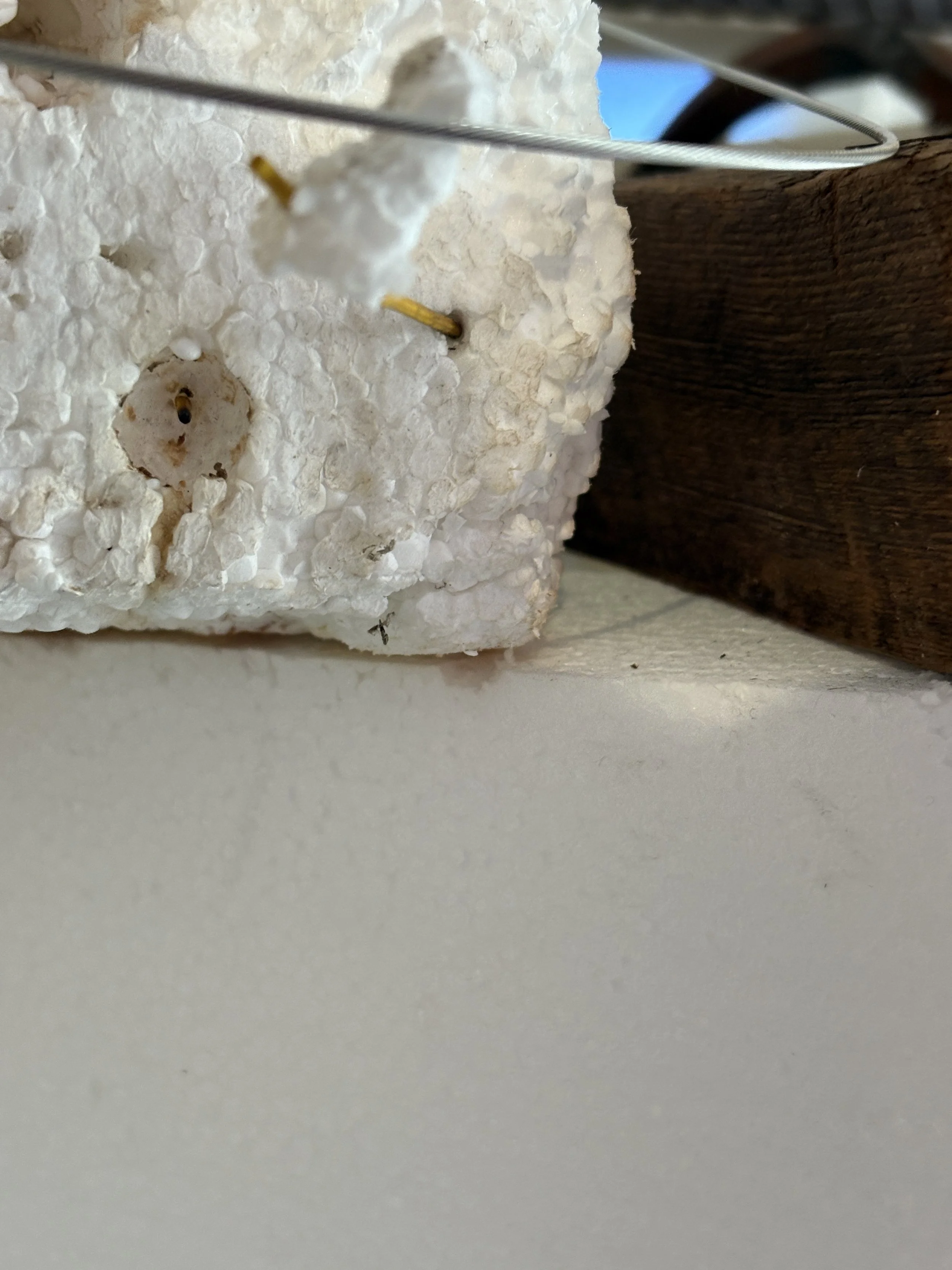 I dig dig dig into the ground and I find golf balls, bits of broken glass and what seems to be a mix of sand and microplastics. I don't know what year it is. I gather this polystyrene and I stack it. I wrap it with wire, I twist it all around, I wring out my hands with confusion and resolve to learn more. I learn more each time I speak with her, when I commune with her divine grace, when he reaches towards me with joy and squeezes. There are spirits in this plastic. Benzene, flame retardants. Holy things. Strange things. I live a little bit more and observe the trail I leave behind. I trace my fingers through the muck and dust and leave remnants behind. I am a remnant, I am left behind, borrowing from the giants and tucking myself in using their big smelly socks.