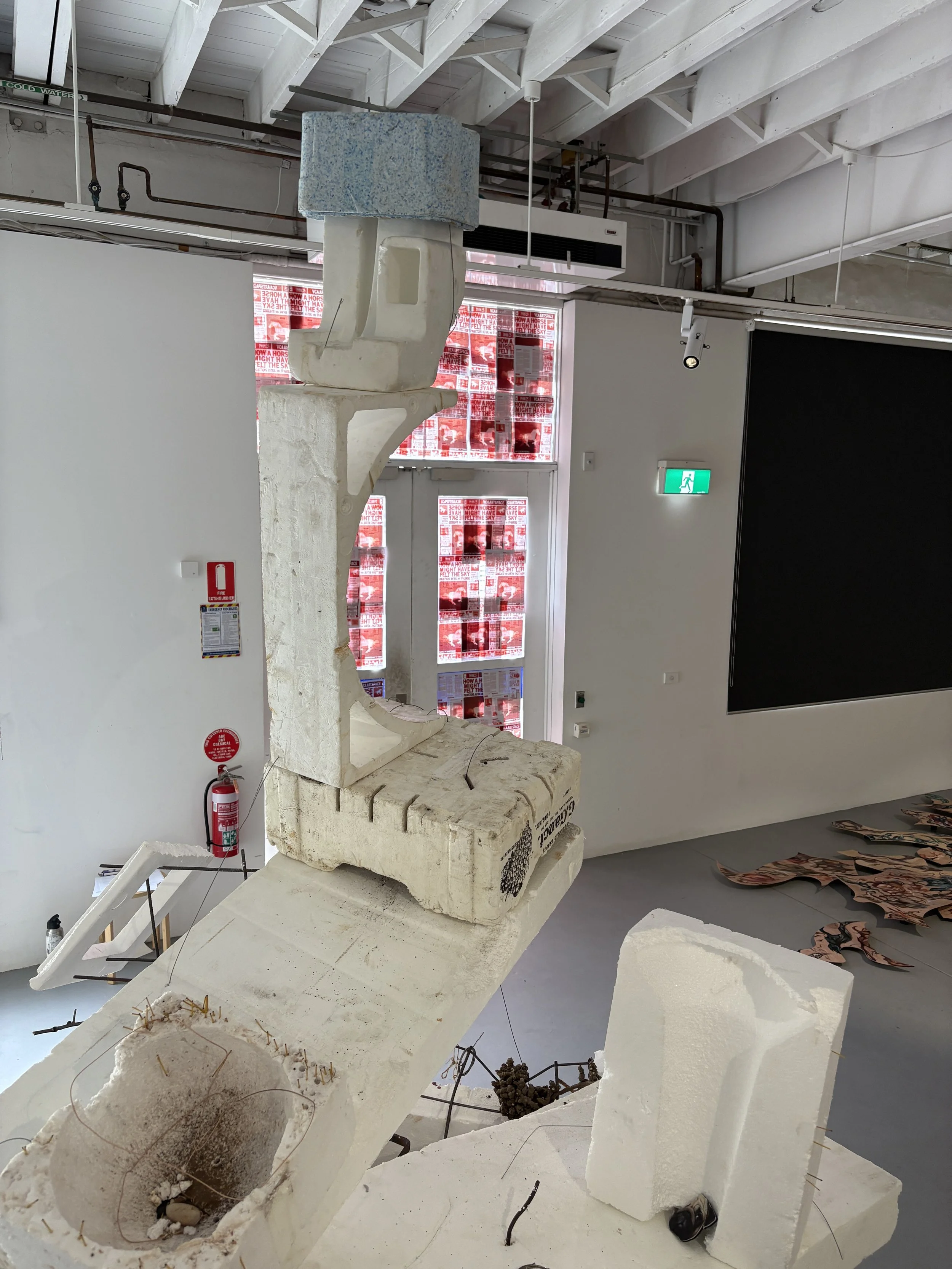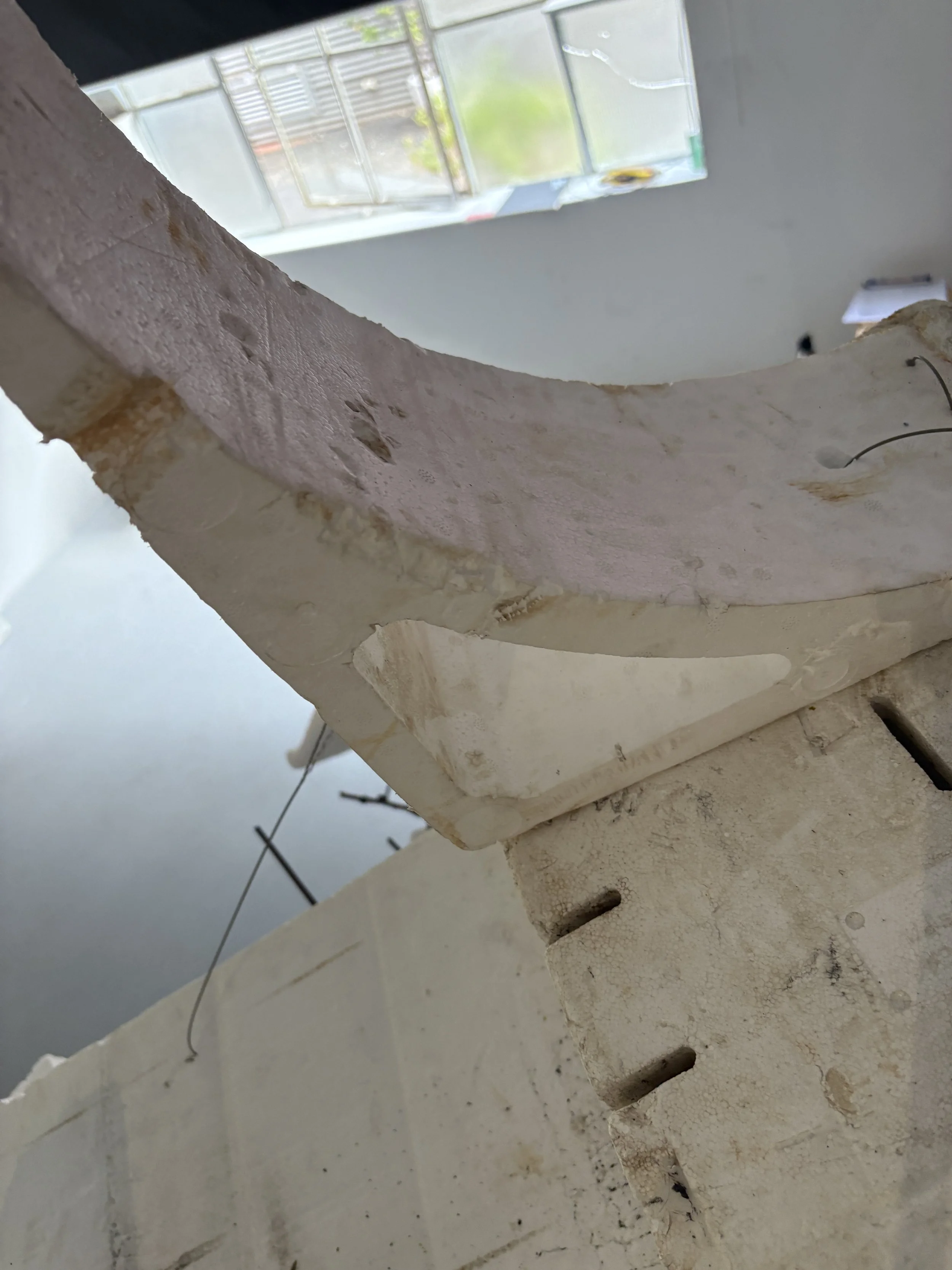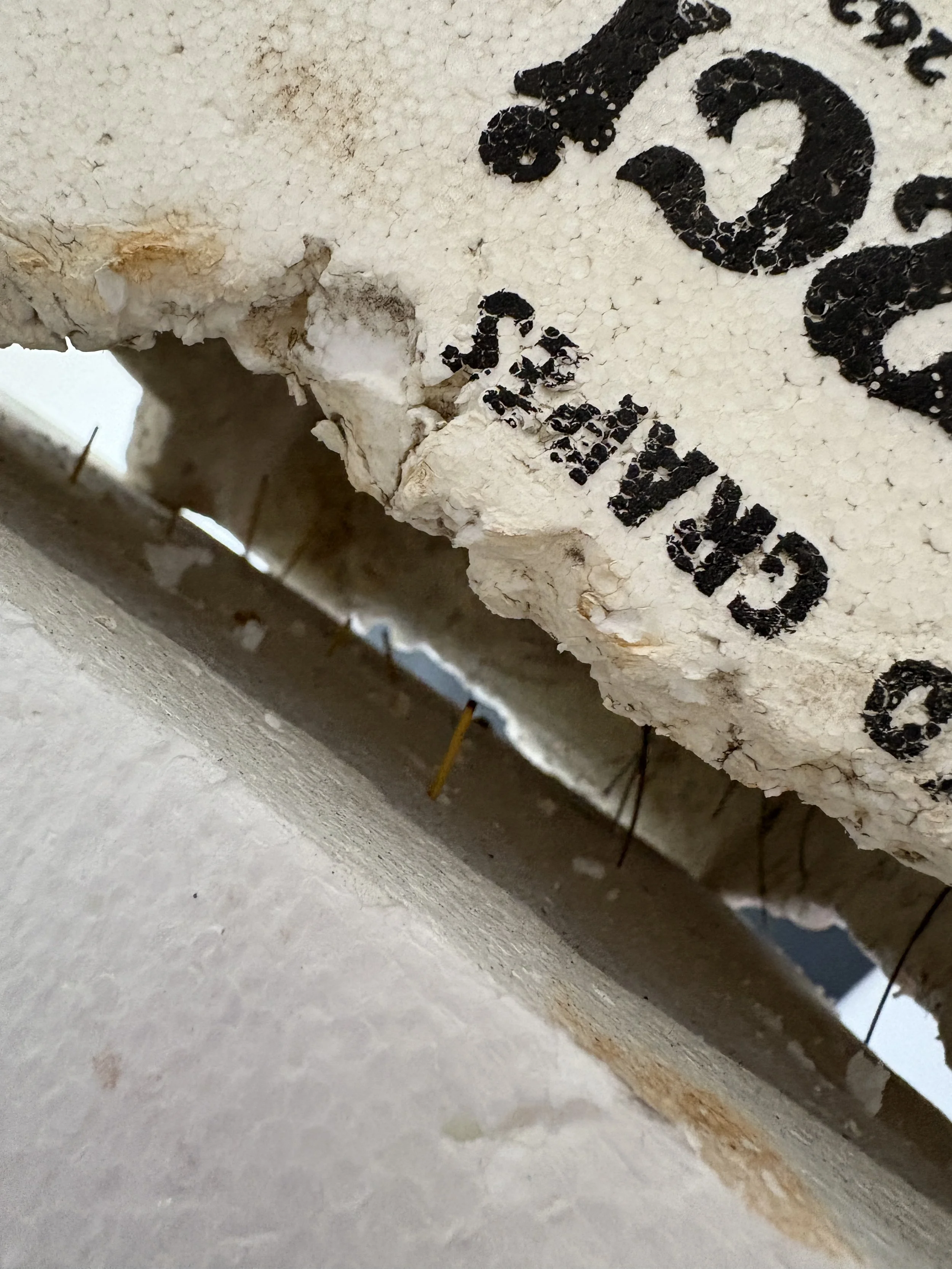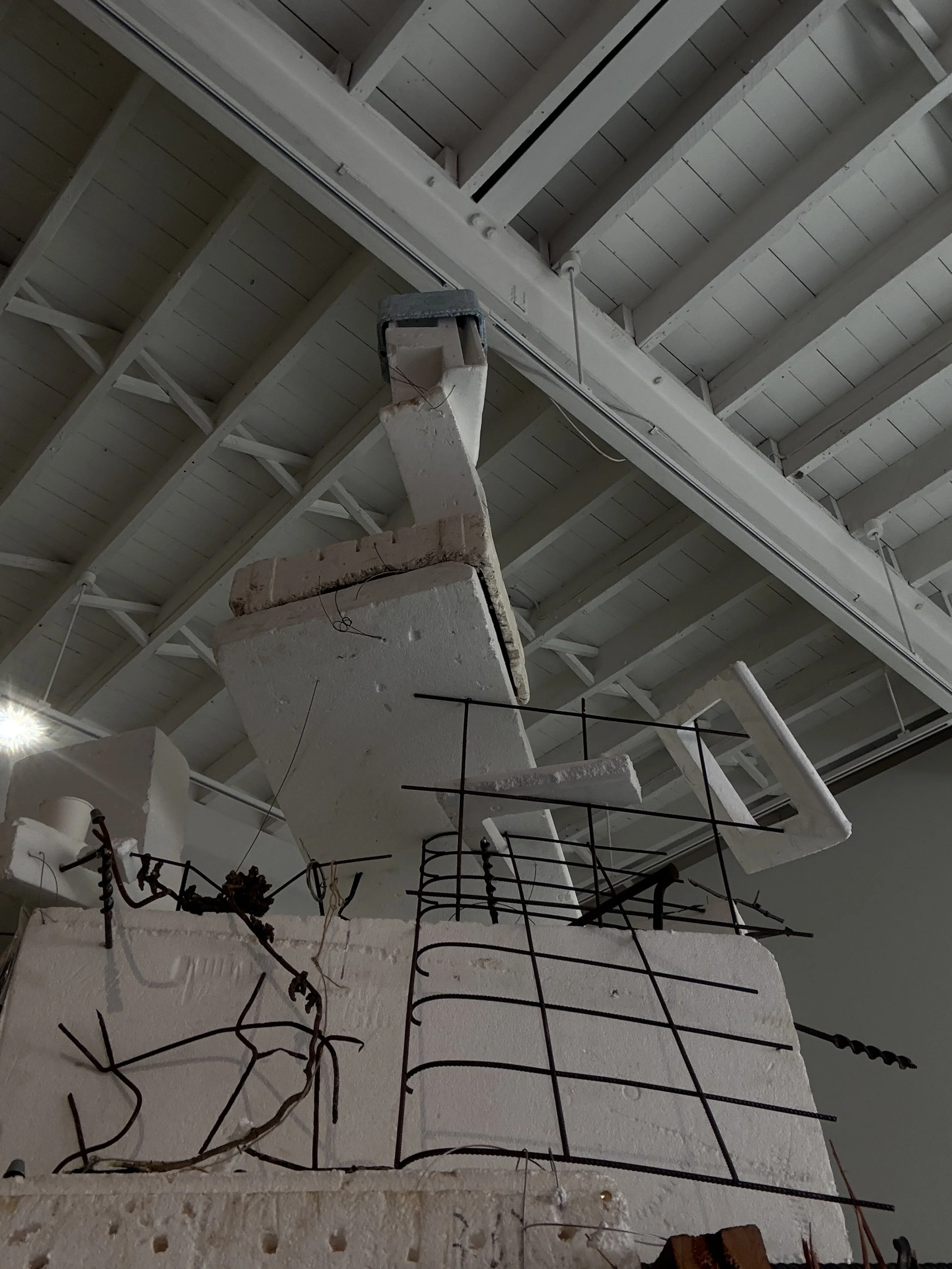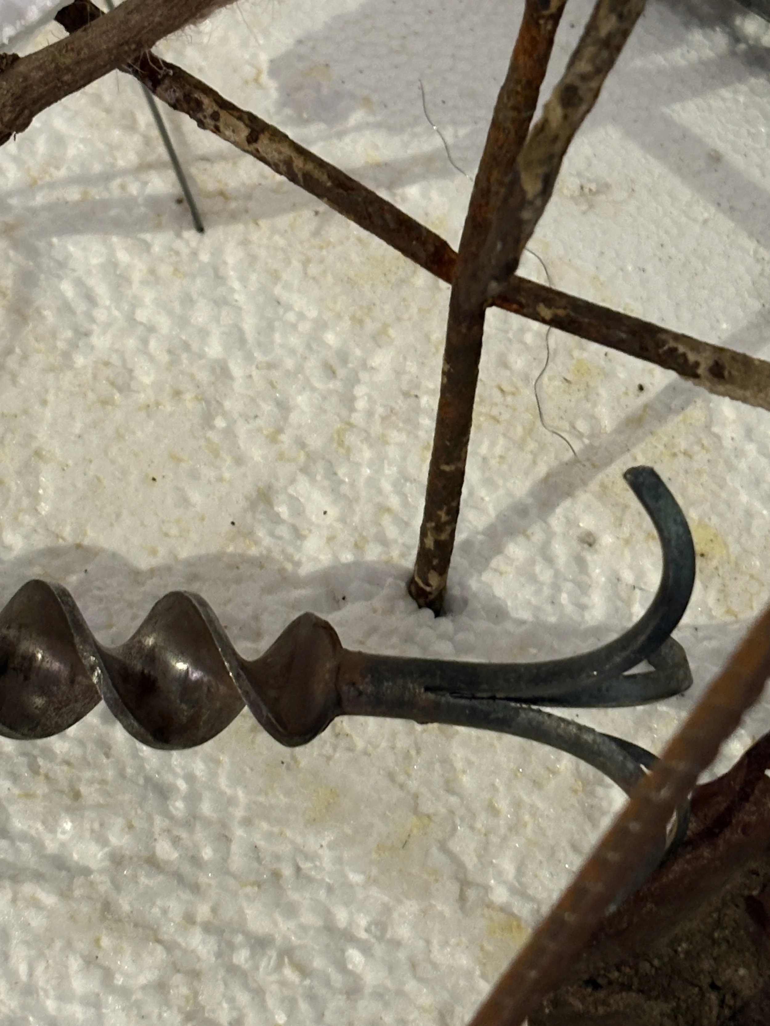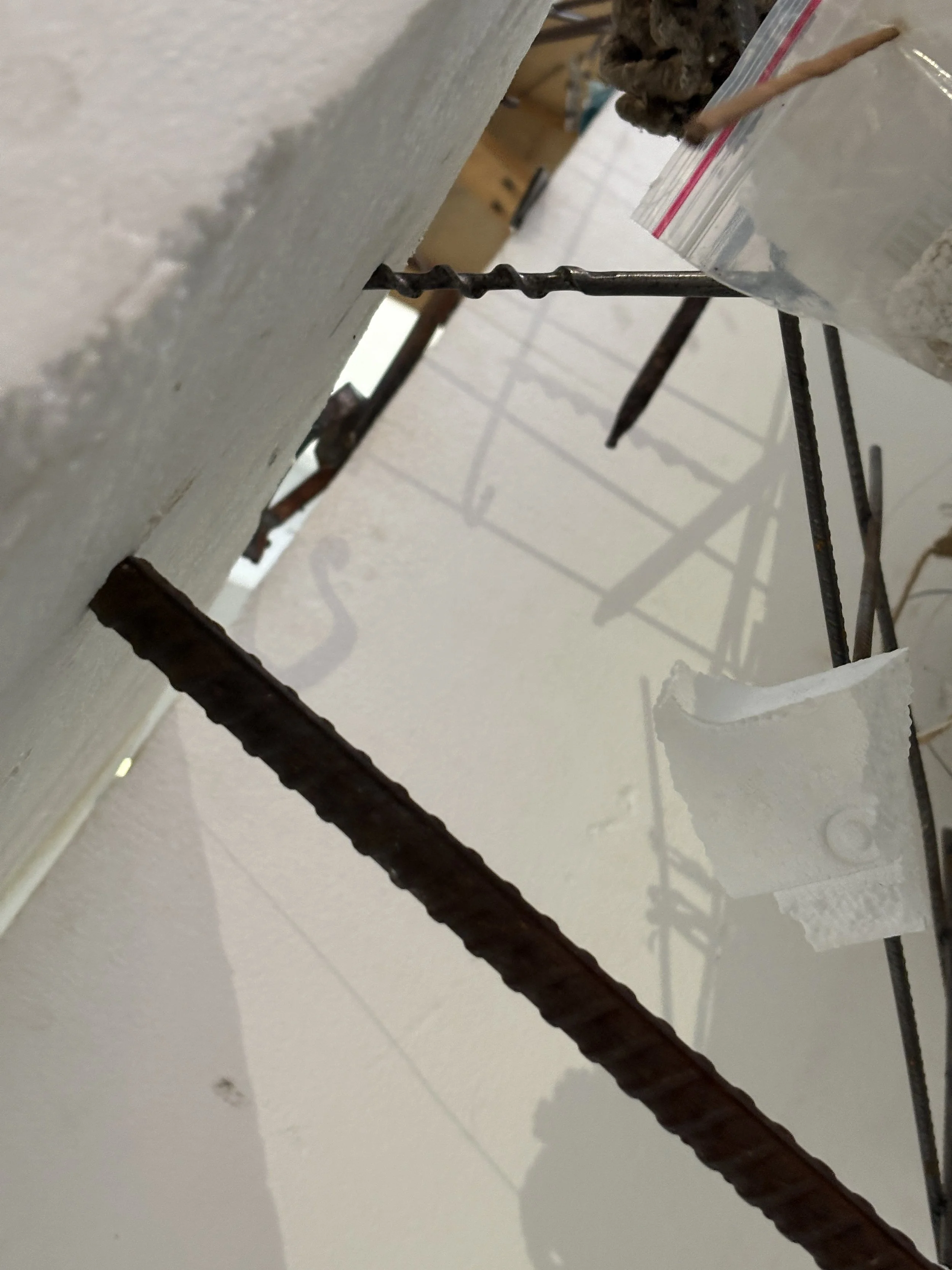 I dig dig dig into the ground and I find golf balls, bits of broken glass and what seems to be a mix of sand and microplastics. I don't know what year it is. I gather this polystyrene and I stack it. I wrap it with wire, I twist it all around, I wring out my hands with confusion and resolve to learn more. I learn more each time I speak with her, when I commune with her divine grace, when he reaches towards me with joy and squeezes. There are spirits in this plastic. Benzene, flame retardants. Holy things. Strange things. I live a little bit more and observe the trail I leave behind. I trace my fingers through the muck and dust and leave remnants behind. I am a remnant, I am left behind, borrowing from the giants and tucking myself in using their big smelly socks.